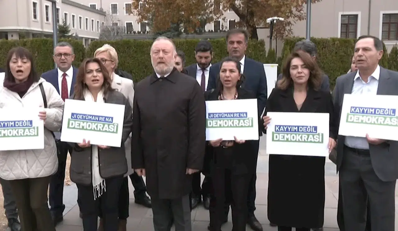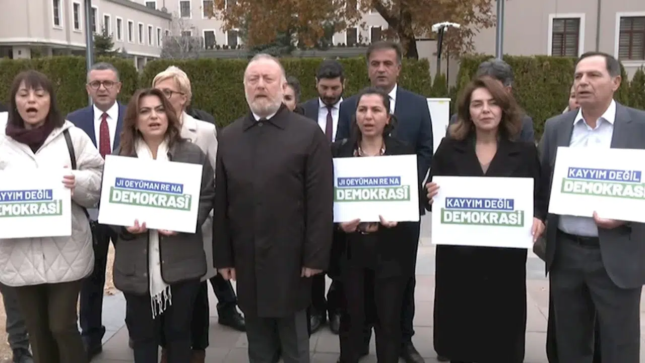 DEM Parti Grup Başkan Vekili Gülüstan Koçyiğit, milletvekilleri ve partililerle birlikte İçişleri Bakanlığı önünde basın açıklaması yaptı. Koçyiğit, kayyımın iradeyi yok saymak olduğunu söyleyerek, "Kayyım, Türkiye'de demokrasi adına kalan bütün kırıntıları yok sayan yeni bir rejimin adıdır, AK Parti iktidarının en temel niteliğidir. Hukuksuzluk kendini anayasayla bağlı hissetmeyen, kendini demokrasiye bağlı hissetmeyen, kendi sandıktan çıktığı sürece o sandığa saygı duyan; ama muhalefet, ama halkın başka tercihleri olduğunda bütün bu tercihleri yok sayan bu iktidara karşı bugün yan yana gelmemiz, birleşmemiz ve hep beraber demokrasiyi savunmamız gerekiyor" dedi.
