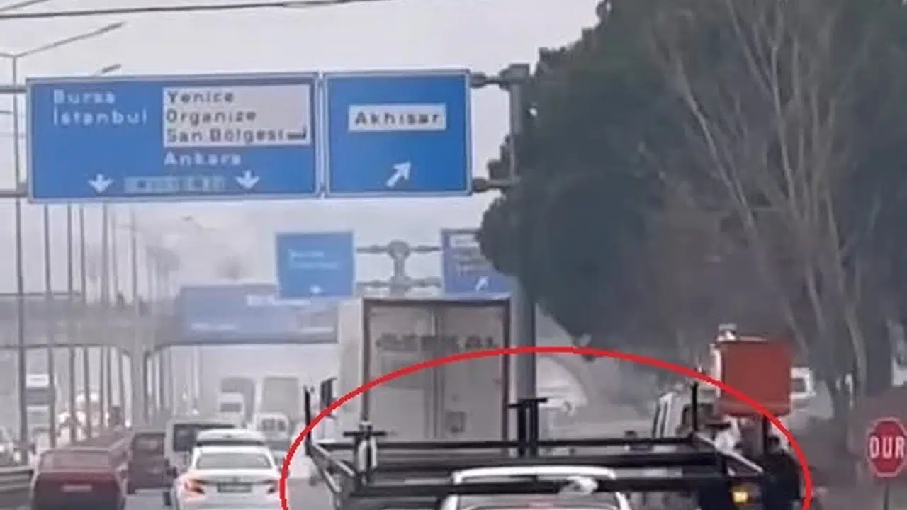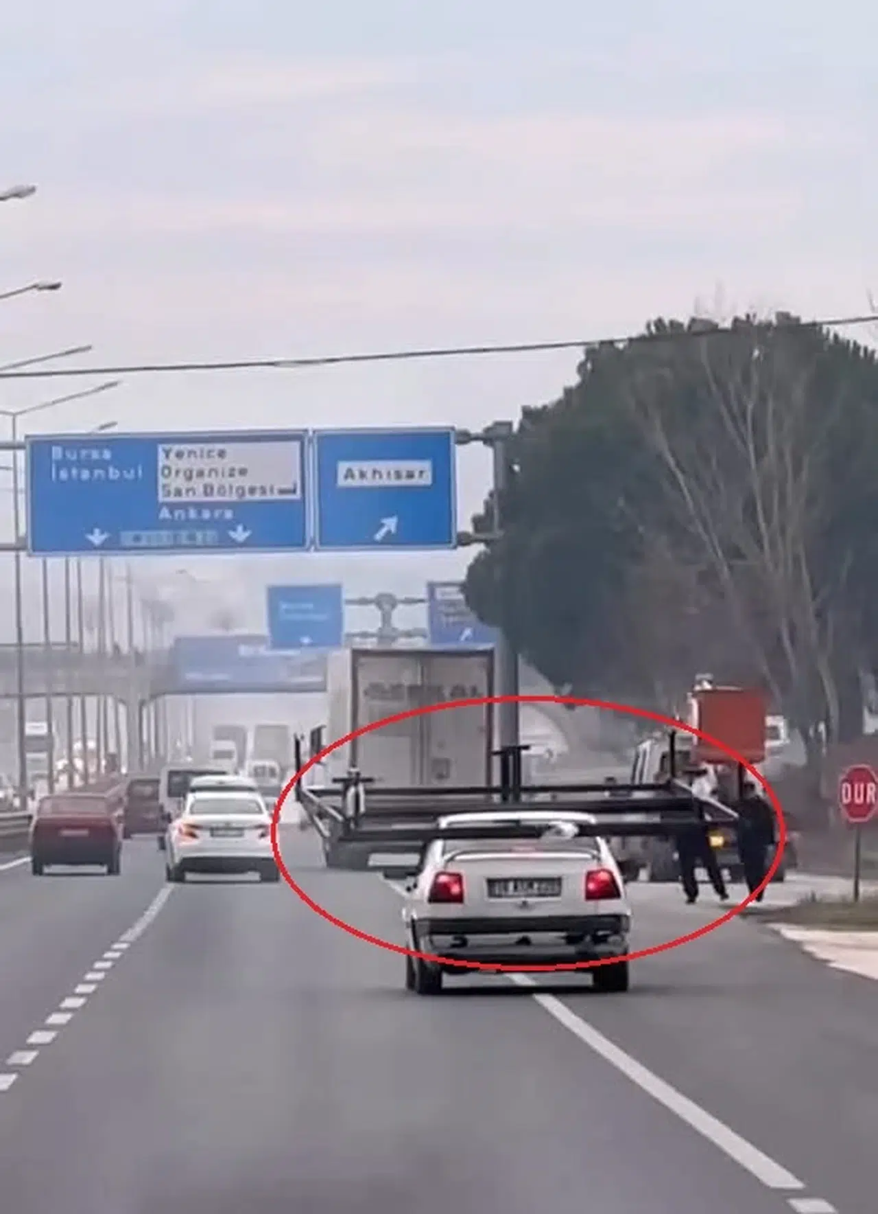 İnegöl’de 16 ASM 220 plakalı otomobilin sürücüsü, otomobilinin tavanına ters olarak koyup, bir ucundan arka tampona iple bağladığı demir karyola ile Bursa-Ankara kara yolunda ilerledi. Sürücünün tehlikeli seyri, bir başka sürücü tarafından cep telefonu kamerasıyla kayda alındı. (DHA)