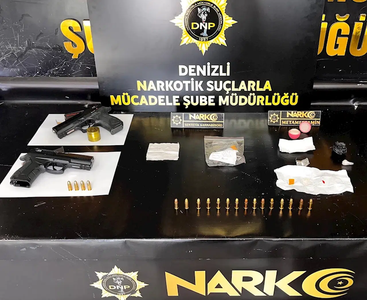 Denizli İl Emniyet Müdürlüğü Narkotik Suçlarla Mücadele Şubesi ekipleri, uyuşturucu tacirlerine yönelik Denizli merkezli Antalya, Uşak ve Hatay’da önceki gün eş zamanlı operasyon düzenledi. Operasyon kapsamında 22 kişi gözaltına alındı. Şüphelilerin evlerinde ve iş yerlerinde yapılan aramalarda 45 parça halinde toplam 1 kilo 197 gram metamfetamin, 5 parça halinde 462 kullanımlık kağıda emdirilmiş sentetik bonzai, 16 adet sentetik ecza, 2 hassas terazi, 3 adet uyuşturucu madde kullanma aparatı, 1 adet esrar öğütücüsü, 2 ruhsatsız tabanca ve uyuşturucu madde ticaretinden elde edildiği değerlendirilen 11 bin lira para ele geçirildi. Gözaltına alınan 1 şüpheli ifadesinin ardından savcılık talimatıyla serbest bırakıldı. Adliyeye sevk edilen 21 şüpheliden 19'u tutuklanırken, 2'si adli kontrol şartıyla serbest bırakıldı. (DHA)