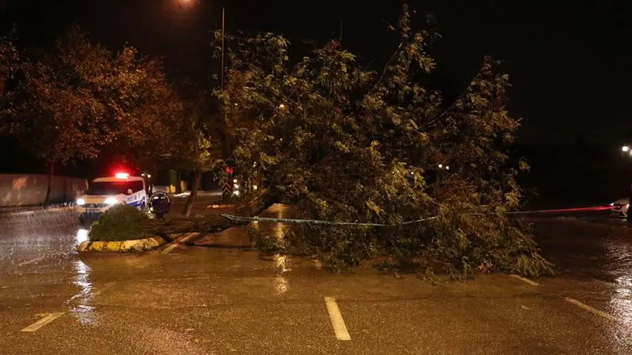 Şehit Öğretmen Yusuf Batur Caddesi'nde ağaçlar şiddetli rüzgar nedeniyle yerinden söküldü.