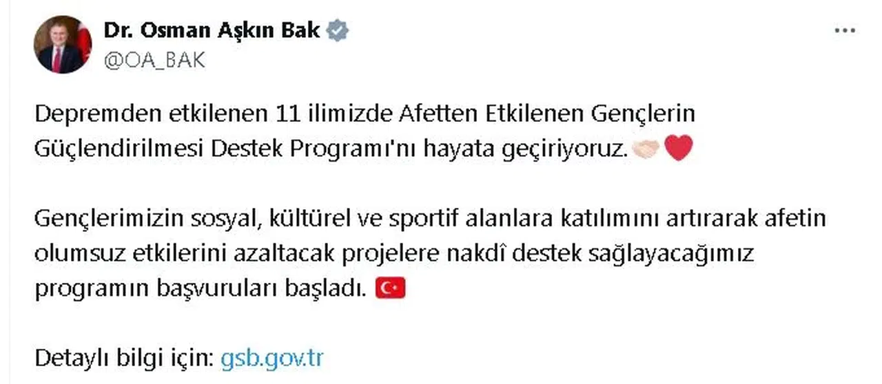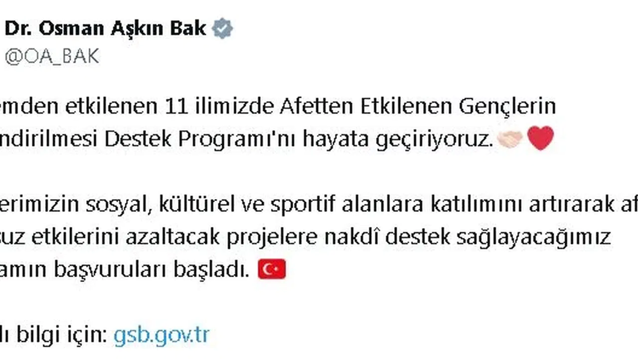 ANKARA, (DHA)- GENÇLİK ve Spor Bakanı Osman Aşkın Bak, depremden etkilenen 11 ilde Afetten Etkilenen Gençlerin Güçlendirilmesi Destek Programı'na başvuruların başladığını açıkladı.