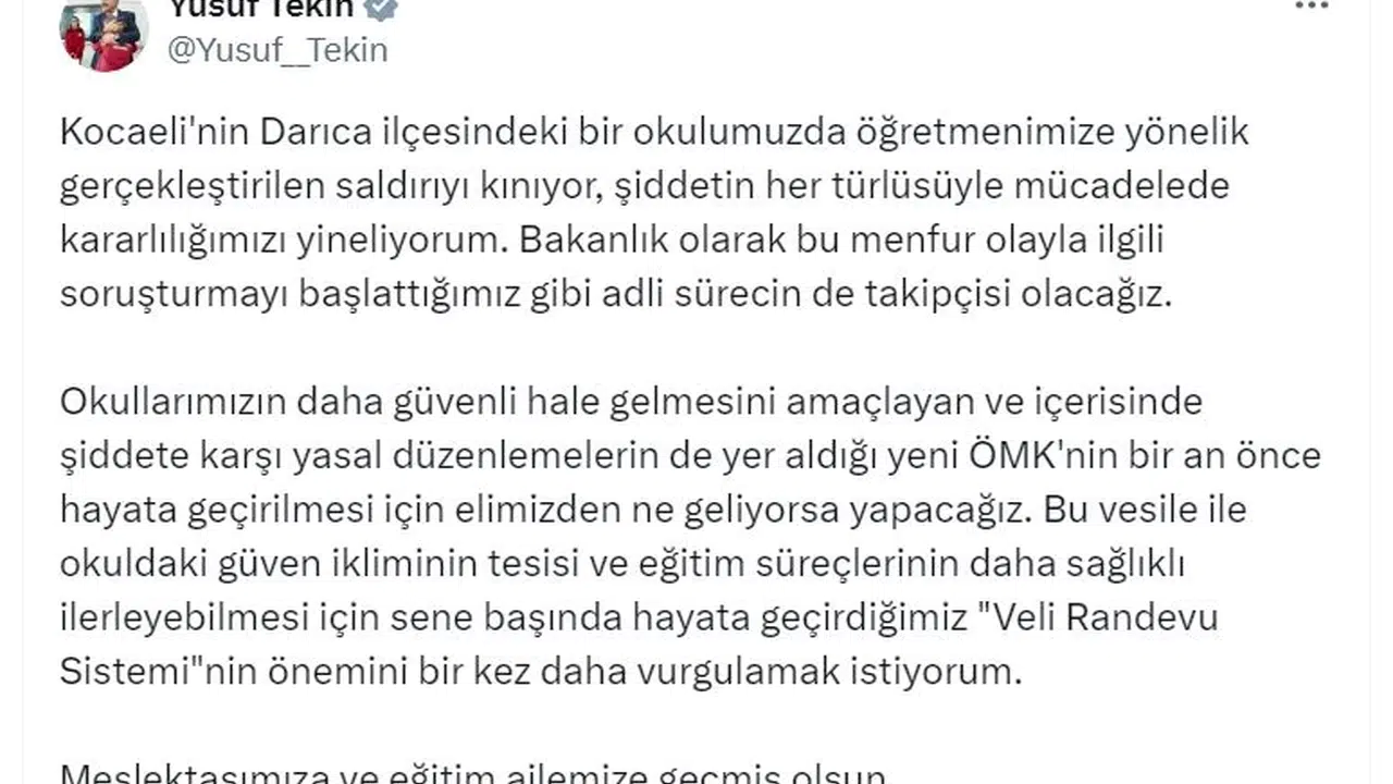Okulların daha güvenli hale gelmesini amaçlayan ve içerisinde şiddete karşı yasal düzenlemelerin de yer aldığı yeni Öğretmenlik Meslek Kanunu'nun bir an önce hayata geçirilmesi için ellerinden geleni yapacaklarını vurgulayan Tekin, "Bu vesile ile okuldaki güven ikliminin tesisi ve eğitim süreçlerinin daha sağlıklı ilerleyebilmesi için sene başında hayata geçirdiğimiz 'Veli Randevu Sistemi'nin önemini bir kez daha vurgulamak istiyorum. Meslektaşımıza ve eğitim ailemize geçmiş olsun" ifadelerini kullandı. (DHA)