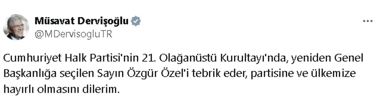 Müsavat Dervişoğlu, sosyal medya hesabından yaptığı paylaşımda, "Cumhuriyet Halk Partisi'nin 21'inci Olağanüstü Kurultayı'nda, yeniden Genel Başkanlığa seçilen Sayın Özgür Özel'i tebrik eder, partisine ve ülkemize hayırlı olmasını dilerim" ifadelerini kullandı. (DHA)