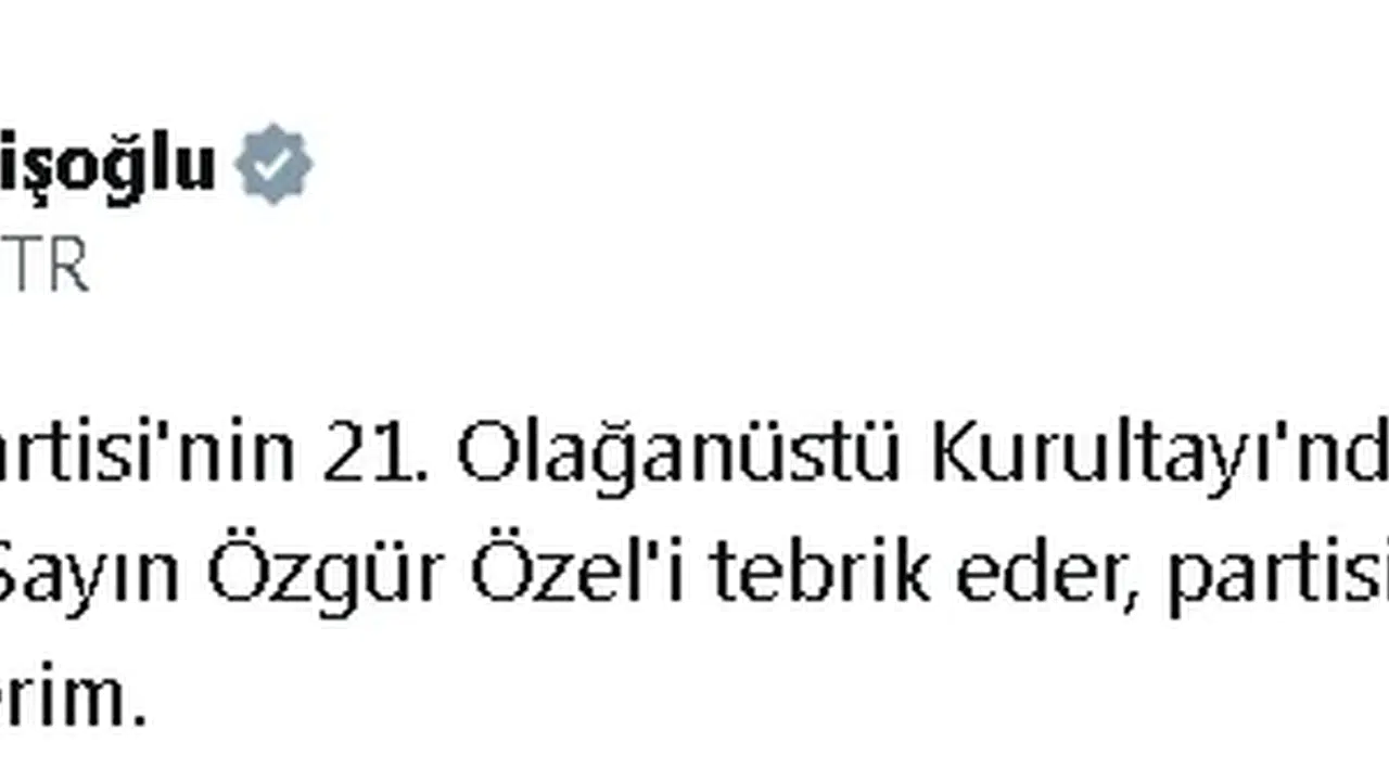 ANKARA, (DHA)- İYİ Parti Genel Başkanı Müsavat Dervişoğlu, CHP'nin 21'inci Olağanüstü Kurultayı'nda yeniden genel başkanlığa seçilen Özgür Özel'i tebrik etti.