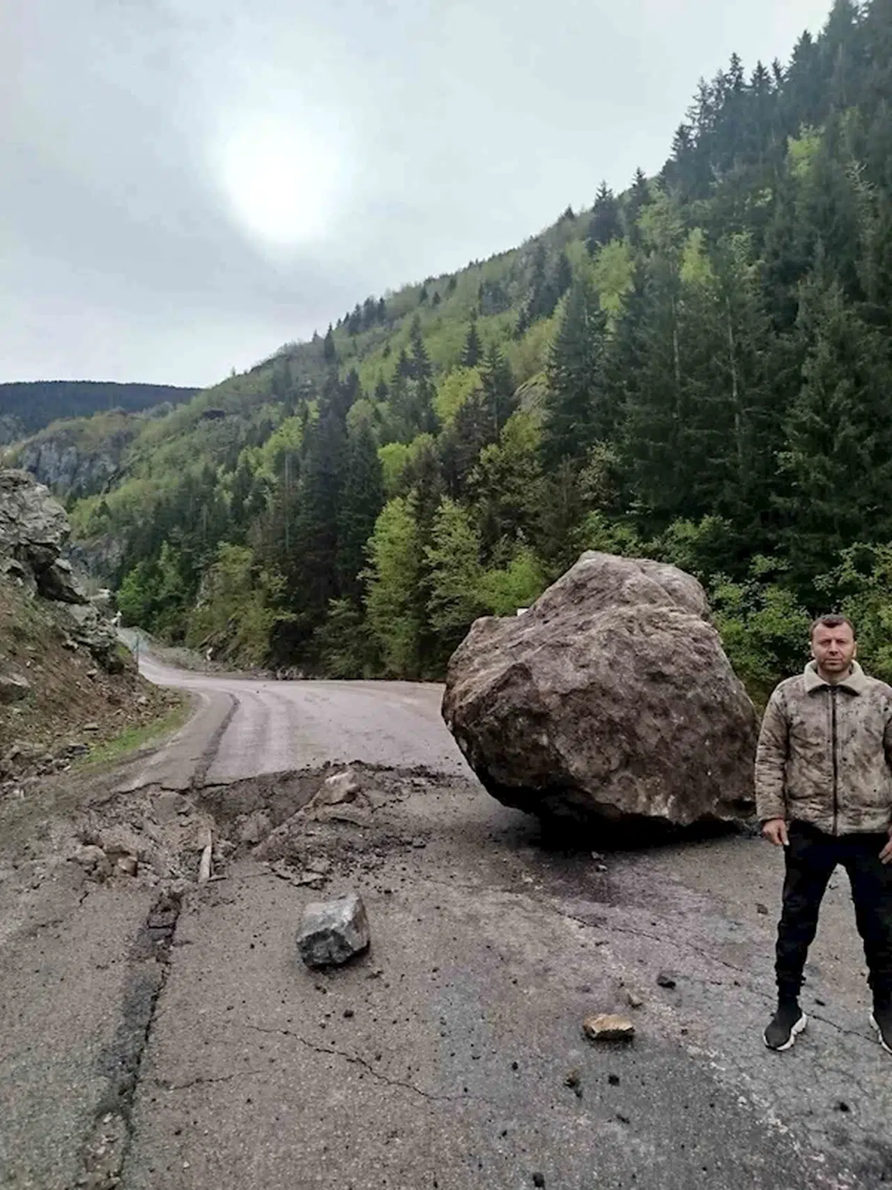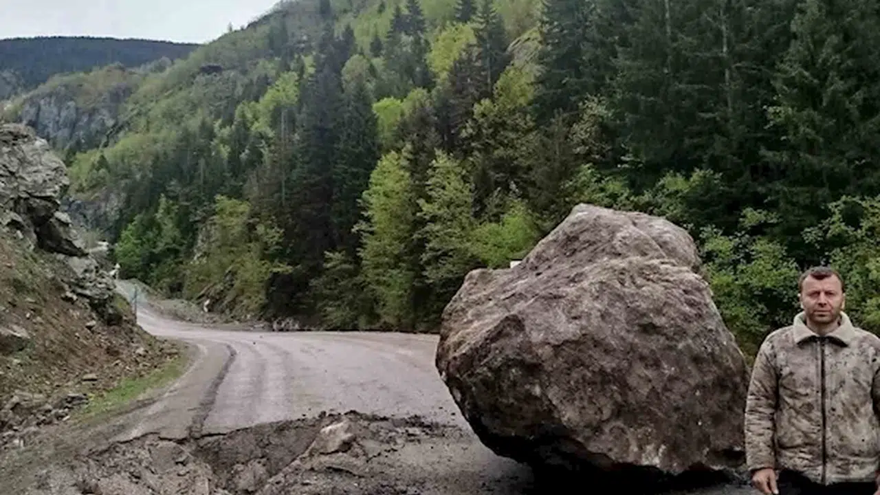 Selda FIRAT/ GÜMÜŞHANE, (DHA)- GÜMÜŞHANE’de meydana gelen heyelanda yamaçtan kopan dev kaya parçası, Erikbeli Yaylası'na ulaşım sağlanan yola düştü. Ekipler iş makinesiyle kayayı kaldırarak kapanan yolu ulaşıma açarken, yaylaya gitmek üzere yola çıkan arkadaş grubu da dev kaya parçasının altında kalmaktan son anda kurtuldu. Grup, olay sonrasını cep telefonu kamerasıyla kaydetti.