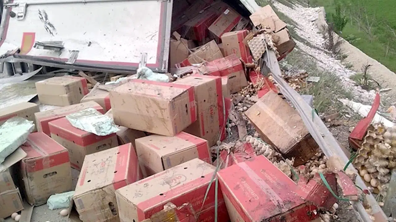 Devrilen TIR'daki yumurtalar yollara saçıldı