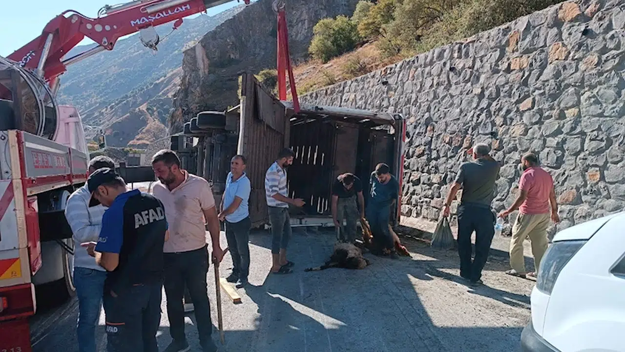Özcan ÇİRİŞ/BİTLİS, (DHA)- BİTLİS'te devrilen TIR'ın dorsesindeki 100'e yakın koyun ve keçi öldü.