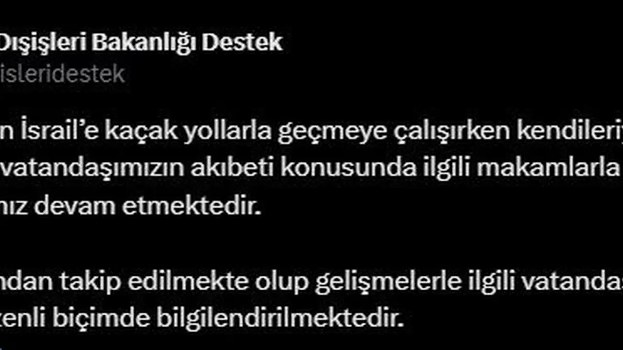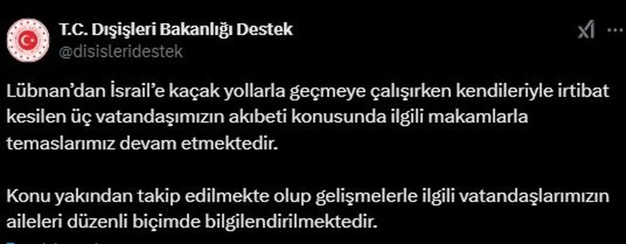 Dışişleri Bakanlığı Destek Merkezi'nin sosyal medya hesabından yapılan açıklamada, "Lübnan'dan İsrail'e kaçak yollarla geçmeye çalışırken kendileriyle irtibat kesilen 3 vatandaşımızın akıbeti konusunda ilgili makamlarla temaslarımız devam etmektedir. Konu yakından takip edilmekte olup gelişmelerle ilgili vatandaşlarımızın aileleri düzenli biçimde bilgilendirilmektedir" denildi. (DHA)