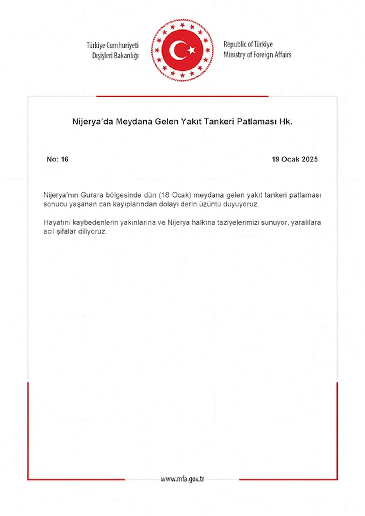 Dışişleri Bakanlığı sosyal medya hesabından yapılan paylaşımda, "Nijerya’nın Gurara bölgesinde 18 Ocak'ta meydana gelen yakıt tankeri patlaması sonucu yaşanan can kayıplarından dolayı derin üzüntü duyuyoruz. Hayatını kaybedenlerin yakınlarına ve Nijerya halkına taziyelerimizi sunuyor, yaralılara acil şifalar diliyoruz" ifadeleri kullanıldı. (DHA)