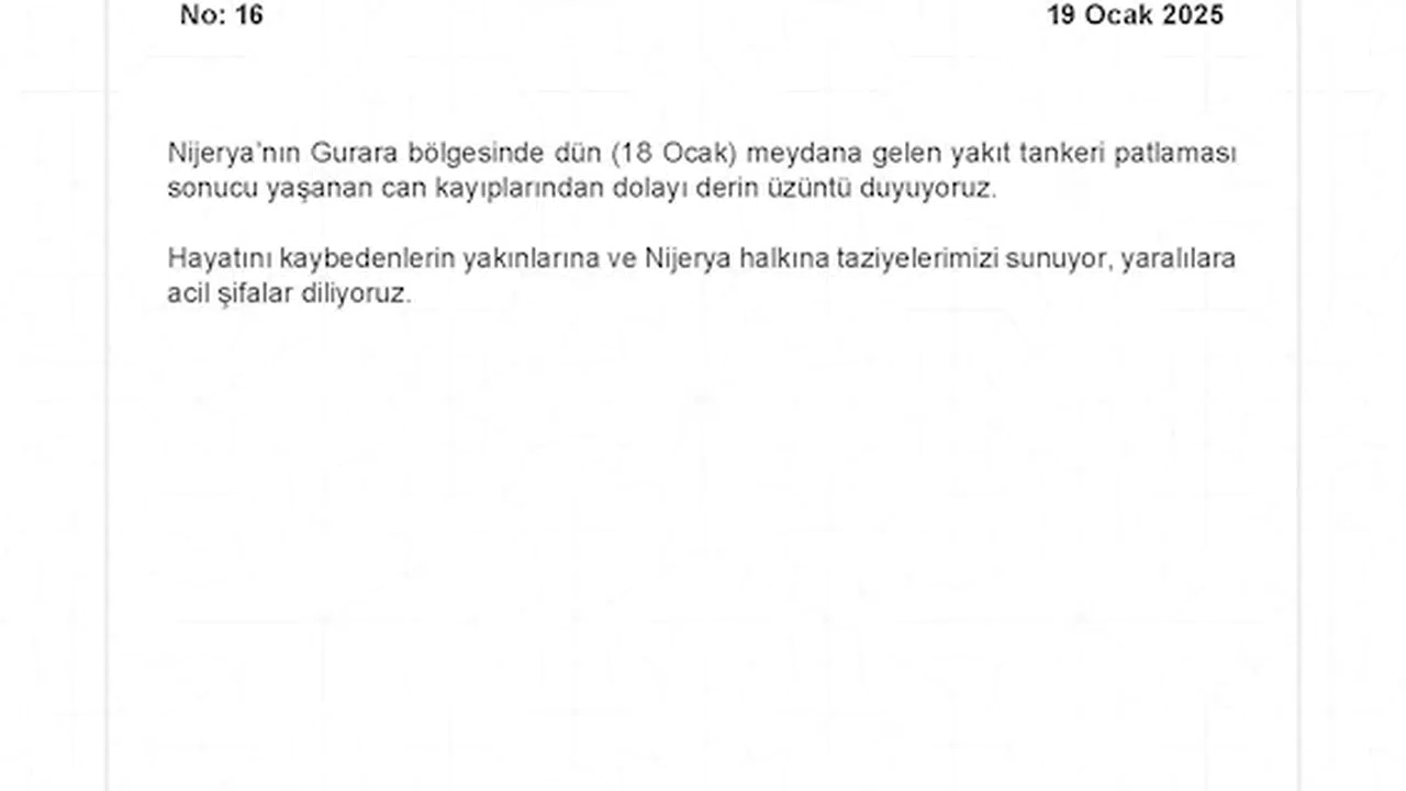ANKARA, (DHA)- DIŞİŞLERİ Bakanlığı, 18 Ocak'ta Nijerya'da yakıt tankerinin patlaması sonucu hayatını kaybedenler için taziye mesajı paylaştı.