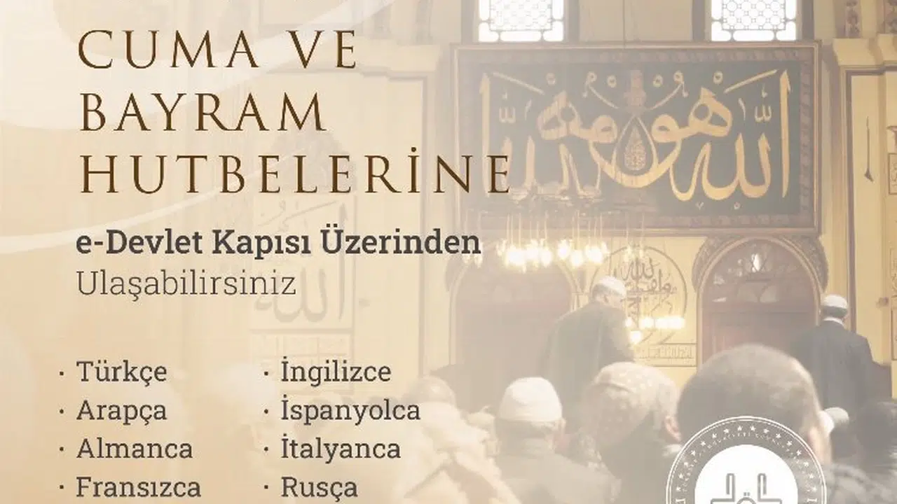 Cumhurbaşkanlığı Dijital Dönüşüm Ofisi'nin sosyal medya hesabından yapılan paylaşımda, Diyanet İşleri Başkanlığı tarafından sunulan cuma ve bayram hutbelerine artık Türkçe, Arapça, Almanca, Fransızca, İngilizce, İspanyolca, İtalyanca ve Rusça olmak üzere 8 farklı dilde e-Devlet Kapısı üzerinden ulaşılabileceğini duyuruldu.