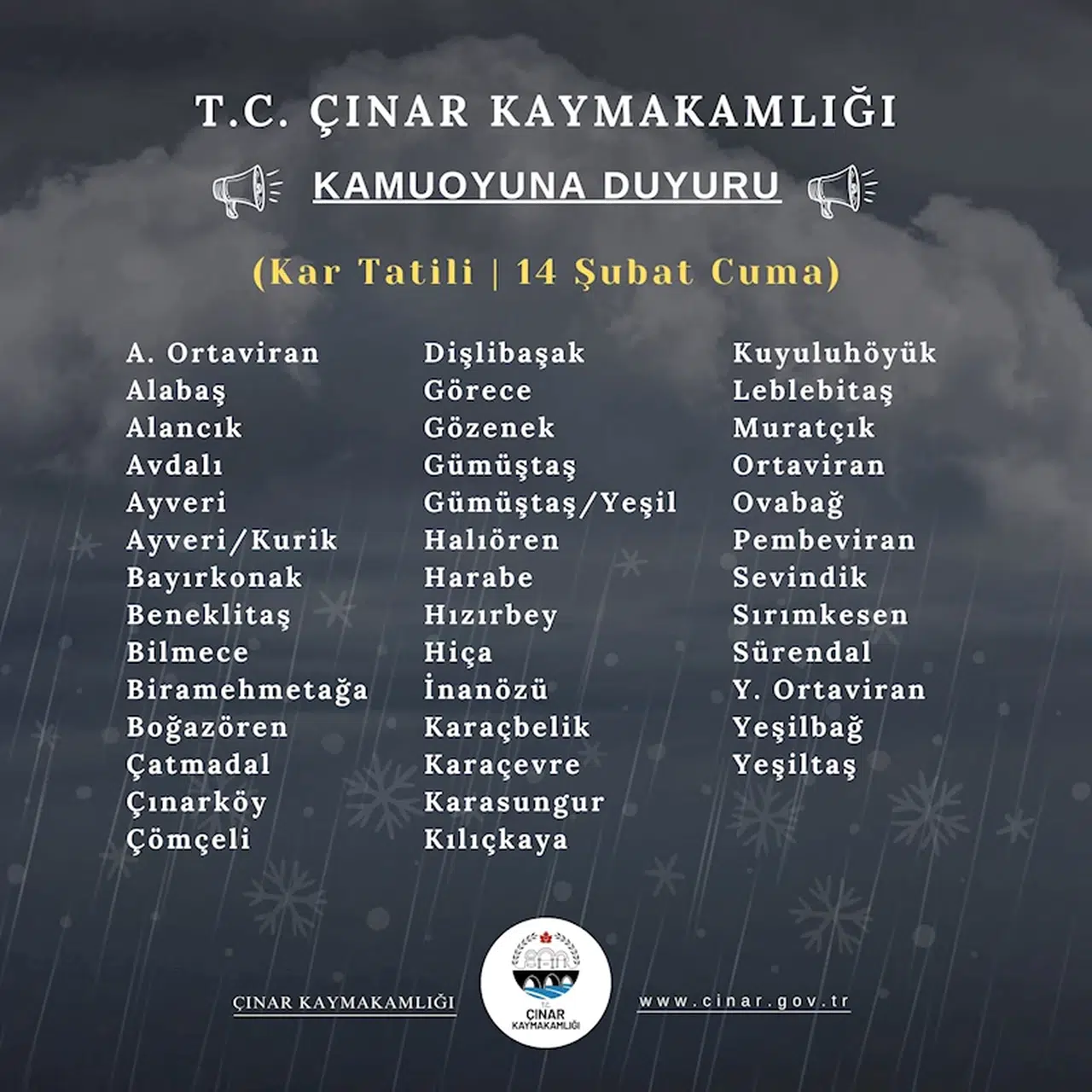 Ergani Kaymakamlığı’ndan yapılan açıklamada da ilçe genelinde taşımalı eğitime 1 gün ara verildiği ifade edilerek, “İlçe Hıfzıssıhha Kurulu kararı gereğince, ilçemiz genelinde taşıma kapsamında olan öğrenciler için ve kırsal mahallelerde bulunan okullarımızda eğitim-öğretime 14.02.2025 tarihinde 1 gün süreyle ara verilmiştir” ifadelerine yer verildi.