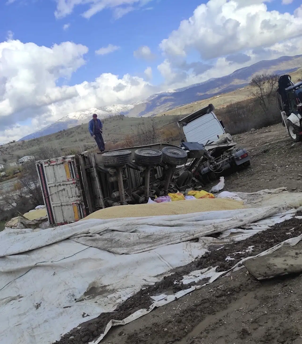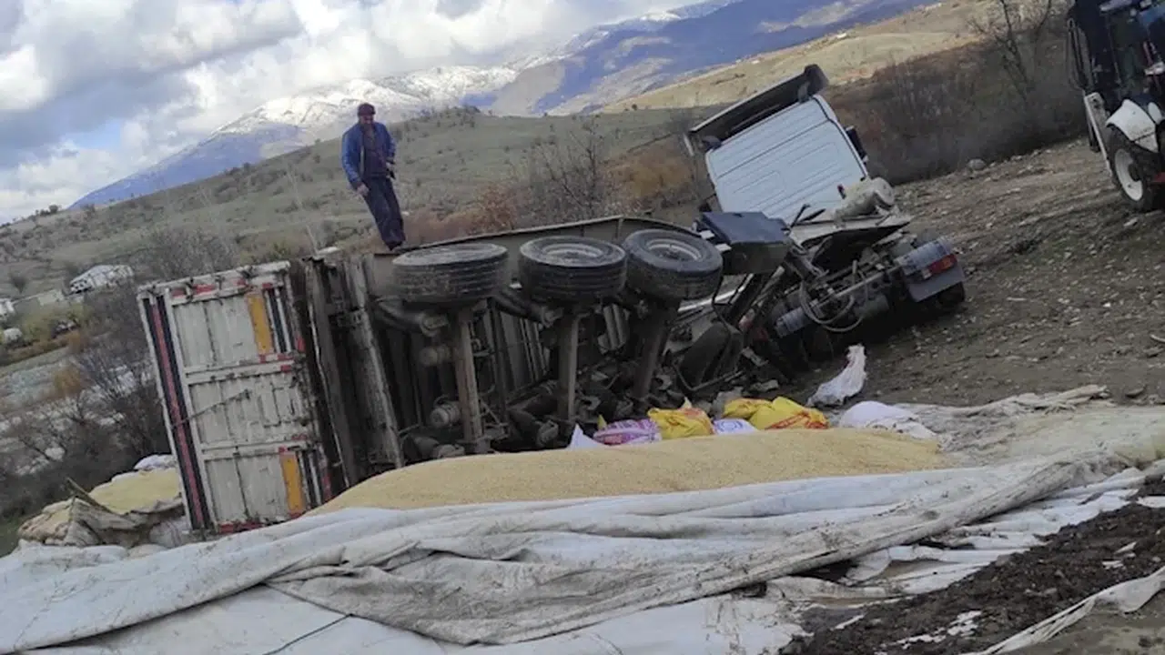 Diyarbakır’da TIR’ın dorsesi devrildi, tonlarca arpa yola saçıldı