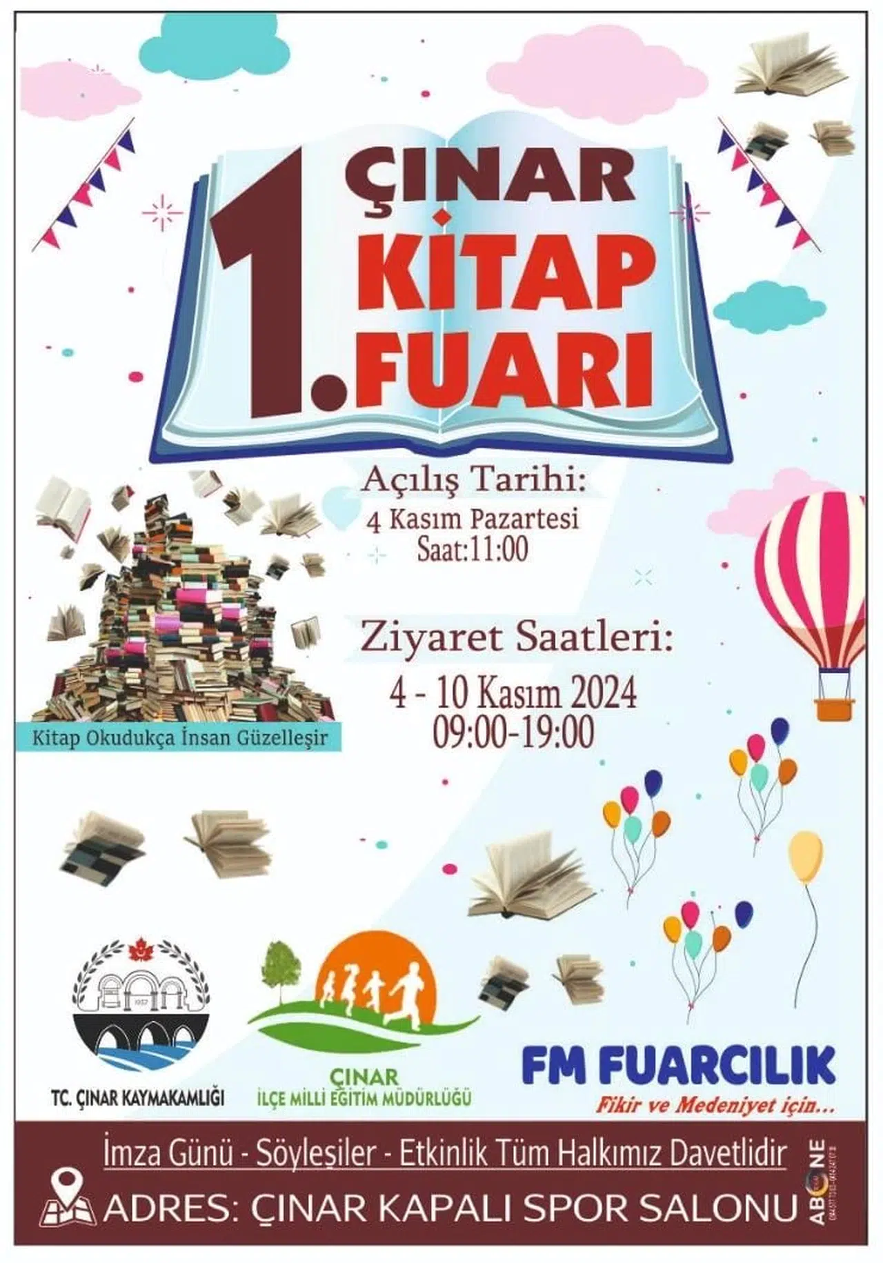 Çınar ilçesinde, 4-10 Kasım tarihleri arasında ilk kez ‘Kitap okudukça insan güzelleşir’ temasıyla kitap fuarı düzenlenecek. İlçe kaymakamı Zikrullah Erdoğan'ın açılışını yapacağı fuarda şair ve yazar Devran Sinanoğlu, onur konuğu olarak yer alacak. Fuara 30 yazar ve şair ile 93 yayınevi katılacak.(DHA)