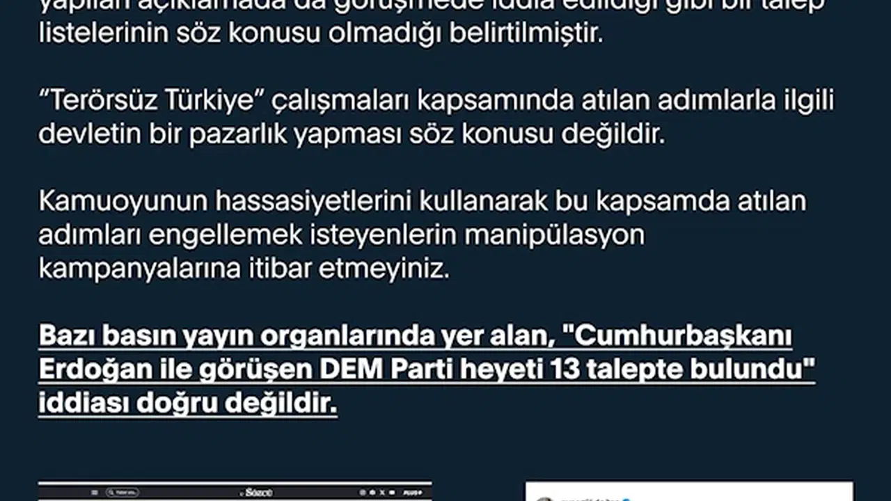 DMM'nin sosyal medya hesabından yapılan açıklamada, "Bazı basın yayın organlarında yer alan, 'Cumhurbaşkanı Erdoğan ile görüşen DEM Parti heyeti 13 talepte bulundu' iddiası doğru değildir. DEM Parti heyetinin Cumhurbaşkanımız Sayın Recep Tayyip Erdoğan'ı ziyaretiyle ilgili ortaya atılan 'talep listesi' iddiaları asılsızdır. Sayın Cumhurbaşkanımızın kabulü sonrası DEM Parti'den yapılan açıklamada da görüşmede iddia edildiği gibi bir talep listelerinin söz konusu olmadığı belirtilmiştir. 'Terörsüz Türkiye' çalışmaları kapsamında atılan adımlarla ilgili devletin bir pazarlık yapması söz konusu değildir. Kamuoyunun hassasiyetlerini kullanarak bu kapsamda atılan adımları engellemek isteyenlerin manipülasyon kampanyalarına itibar etmeyiniz" denildi. (DHA)