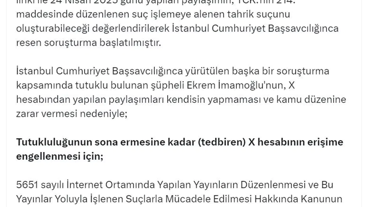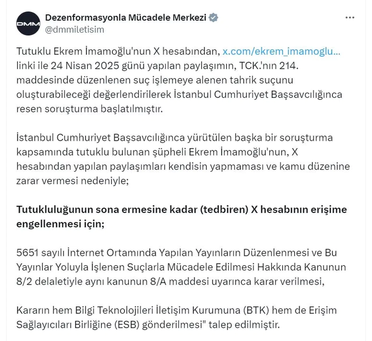 DMM'nin sosyal medya hesabından yapılan açıklamada, "Tutuklu Ekrem İmamoğlu'nun X hesabından, 'https://x.com/ekrem_imamoglu?s=21' linki ile 24 Nisan 2025 günü yapılan paylaşımın, TCK'nın 214'üncü maddesinde düzenlenen 'Suç işlemeye alenen tahrik' suçunu oluşturabileceği değerlendirilerek İstanbul Cumhuriyet Başsavcılığı'nca resen soruşturma başlatılmıştır. İstanbul Cumhuriyet Başsavcılığı'nca yürütülen başka bir soruşturma kapsamında tutuklu bulunan şüpheli Ekrem İmamoğlu'nun, X hesabından yapılan paylaşımları kendisi yapmaması ve kamu düzenine zarar vermesi nedeniyle; tutukluluğunun sona ermesine kadar (tedbiren) X hesabının erişime engellenmesi için; 5651 sayılı İnternet Ortamında Yapılan Yayınların Düzenlenmesi ve Bu Yayınlar Yoluyla İşlenen Suçlarla Mücadele Edilmesi Hakkında Kanunun 8/2 delaletiyle aynı kanunun 8/A maddesi uyarınca karar verilmesi, kararın hem Bilgi Teknolojileri İletişim Kurumu'na (BTK) hem de Erişim Sağlayıcıları Birliği'ne (ESB) gönderilmesi talep edilmiştir" denildi.