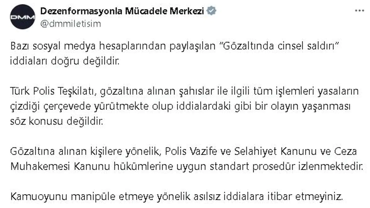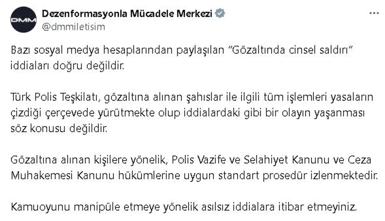 ANKARA, (DHA)- CUMHURBAŞKANLIĞI İletişim Başkanlığı Dezenformasyonla Mücadele Merkezi (DMM), bazı sosyal medya hesaplarından paylaşılan 'Gözaltında cinsel saldırı' iddialarının doğru olmadığını açıkladı.