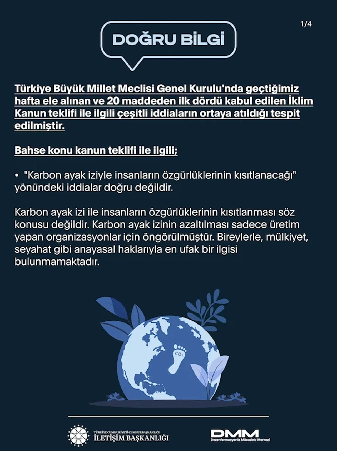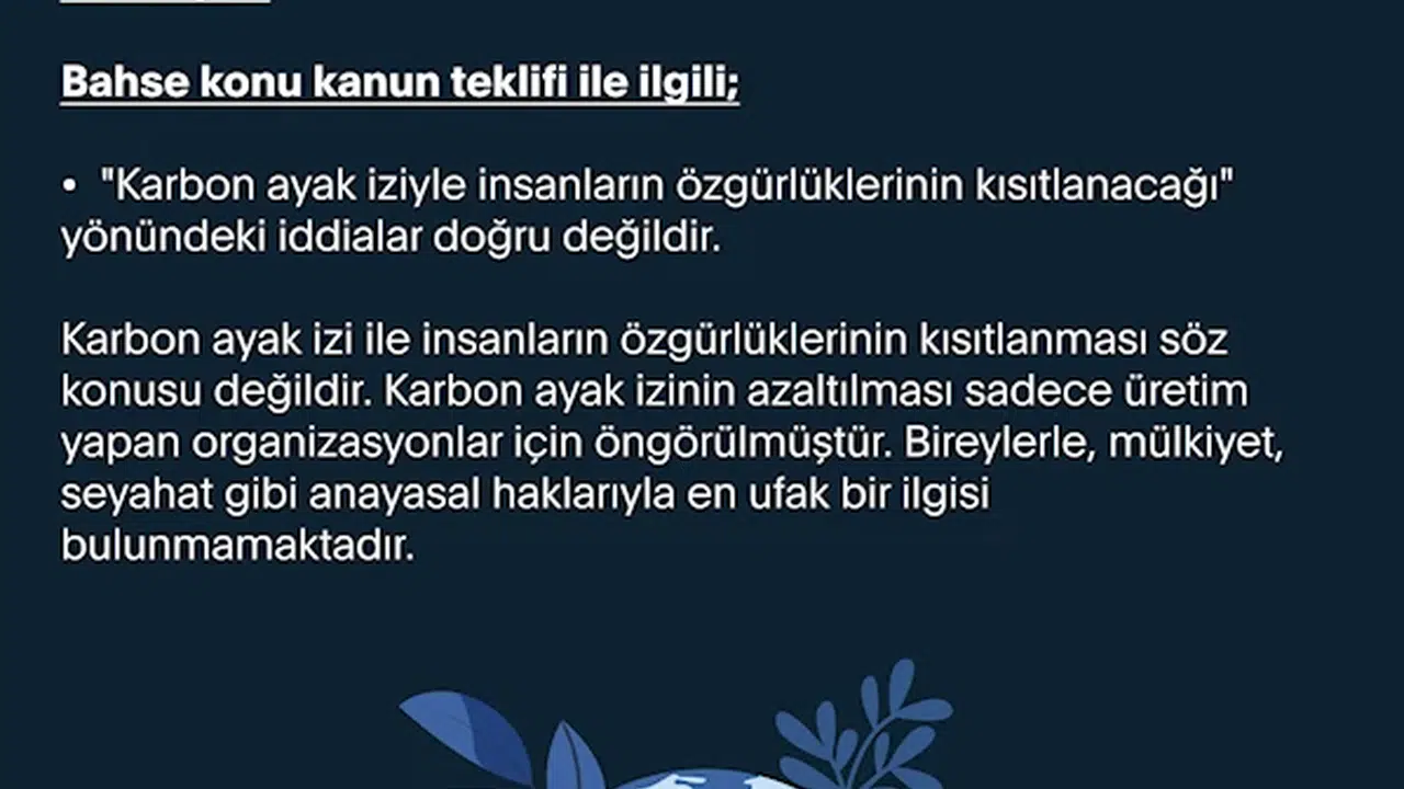 Dezenformasyonla Mücadele Merkezi, sosyal medya hesabından paylaşım yaparak, Türkiye Büyük Millet Meclisi (TBMM) Genel Kurulu’nda görüşülen ve 20 maddeden ilk dördü kabul edilen İklim Kanunu Teklifi’ne ilişkin kamuoyunda yer alan bazı iddiaların gerçeği yansıtmadığını bildirdi. DMM tarafından yapılan açıklamada, 'Karbon ayak iziyle insanların özgürlüklerinin kısıtlanacağı' yönündeki söylemlerin doğru olmadığı vurgulanarak, karbon ayak izinin azaltılmasına yönelik düzenlemelerin sadece üretim yapan organizasyonları kapsadığı, bireylerin anayasal haklarını kısıtlayacak herhangi bir hüküm bulunmadığı ifade edildi.