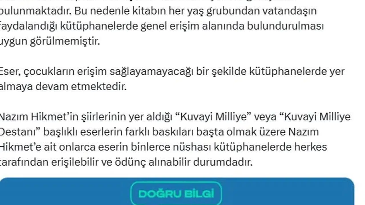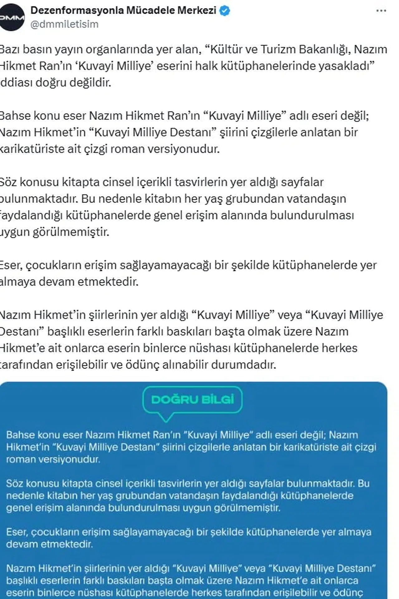 ANKARA, (DHA)- DEZENFORMASYONLA Mücadele Merkezi (DMM), Kültür ve Turizm Bakanlığı'nın Nazım Hikmet Ran'ın 'Kuvayi Milliye' eserini halk kütüphanelerinde yasakladığı yönündeki iddianın doğru olmadığını açıkladı.