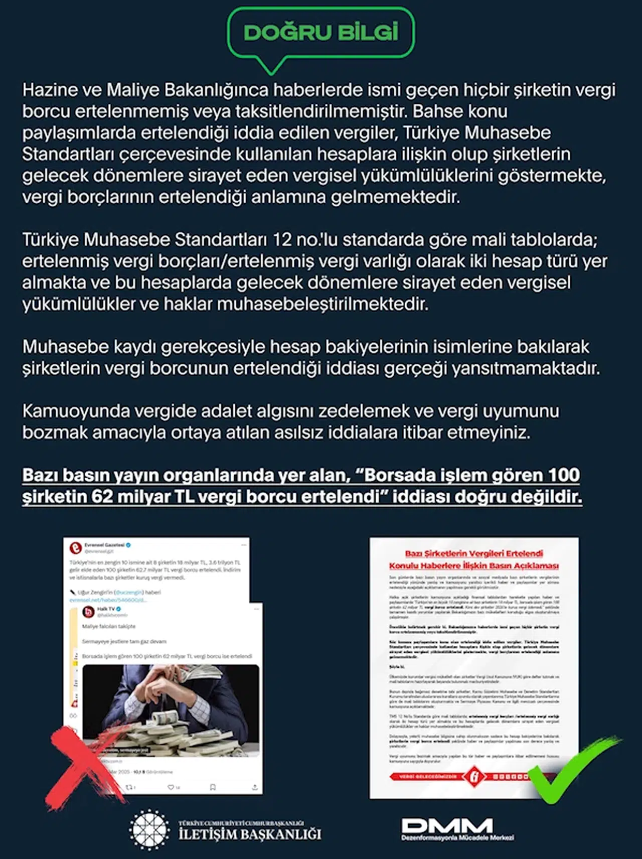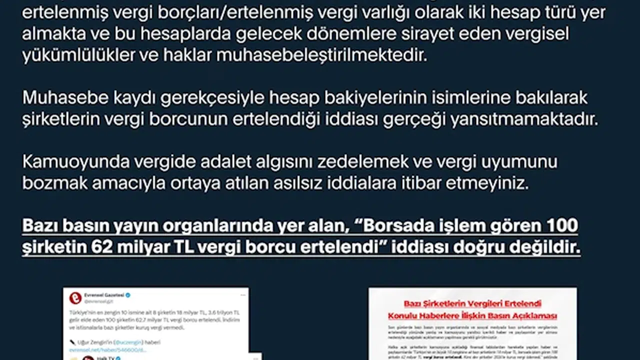 DMM'nin sosyal medya hesabından yapılan açıklamada, "Bazı basın yayın organlarında yer alan, 'Borsada işlem gören 100 şirketin 62 milyar TL vergi borcu ertelendi' iddiası doğru değildir. Hazine ve Maliye Bakanlığı'nca haberlerde ismi geçen hiçbir şirketin vergi borcu ertelenmemiş veya taksitlendirilmemiştir. Bahse konu paylaşımlarda ertelendiği iddia edilen vergiler, Türkiye Muhasebe Standartları çerçevesinde kullanılan hesaplara ilişkin olup, şirketlerin gelecek dönemlere sirayet eden vergisel yükümlülüklerini göstermekte, vergi borçlarının ertelendiği anlamına gelmemektedir. Türkiye Muhasebe Standartları 12 no'lu standarda göre; mali tablolarda, ertelenmiş vergi borçları/ertelenmiş vergi varlığı olarak 2 hesap türü yer almakta ve bu hesaplarda gelecek dönemlere sirayet eden vergisel yükümlülükler ve haklar muhasebeleştirilmektedir. Muhasebe kaydı gerekçesiyle hesap bakiyelerinin isimlerine bakılarak şirketlerin vergi borcunun ertelendiği iddiası gerçeği yansıtmamaktadır. Kamuoyunda vergide adalet algısını zedelemek ve vergi uyumunu bozmak amacıyla ortaya atılan asılsız iddialara itibar etmeyiniz" denildi. (DHA)