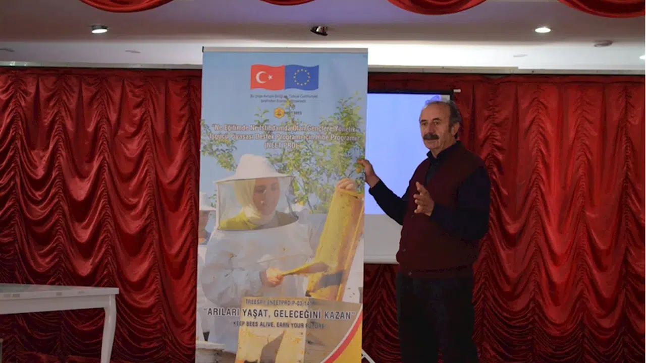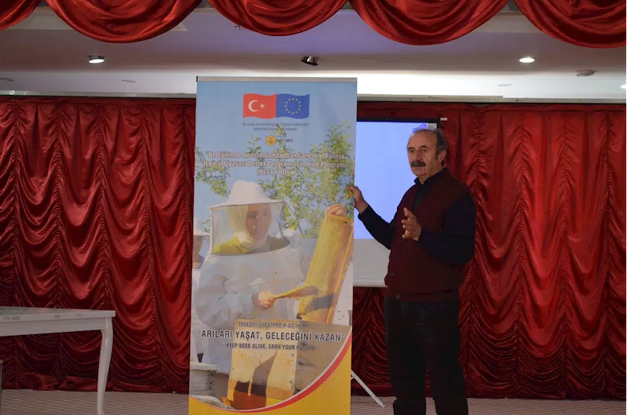 Köylere Hizmet Götürme Birliğince yürütülen "Arıları Yaşat Geleceğini Kazan Projesi" kapsamında Dodurga Belediyesi Kayabaşı kültür salonunda düzenlenen etkinlikte projenin saha koordinatörü Ömer Arslan, arıcılığın önemi hakkında bilgi verdi.