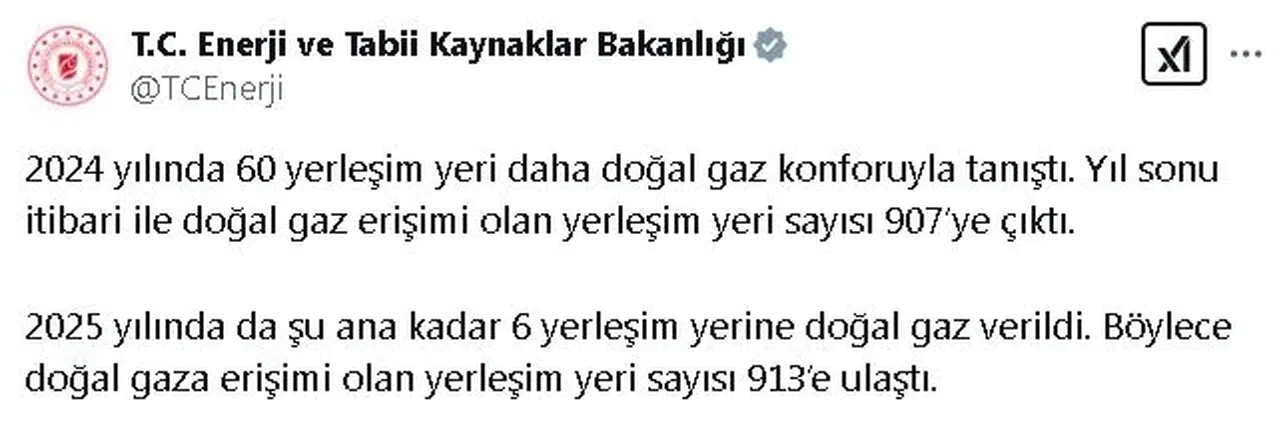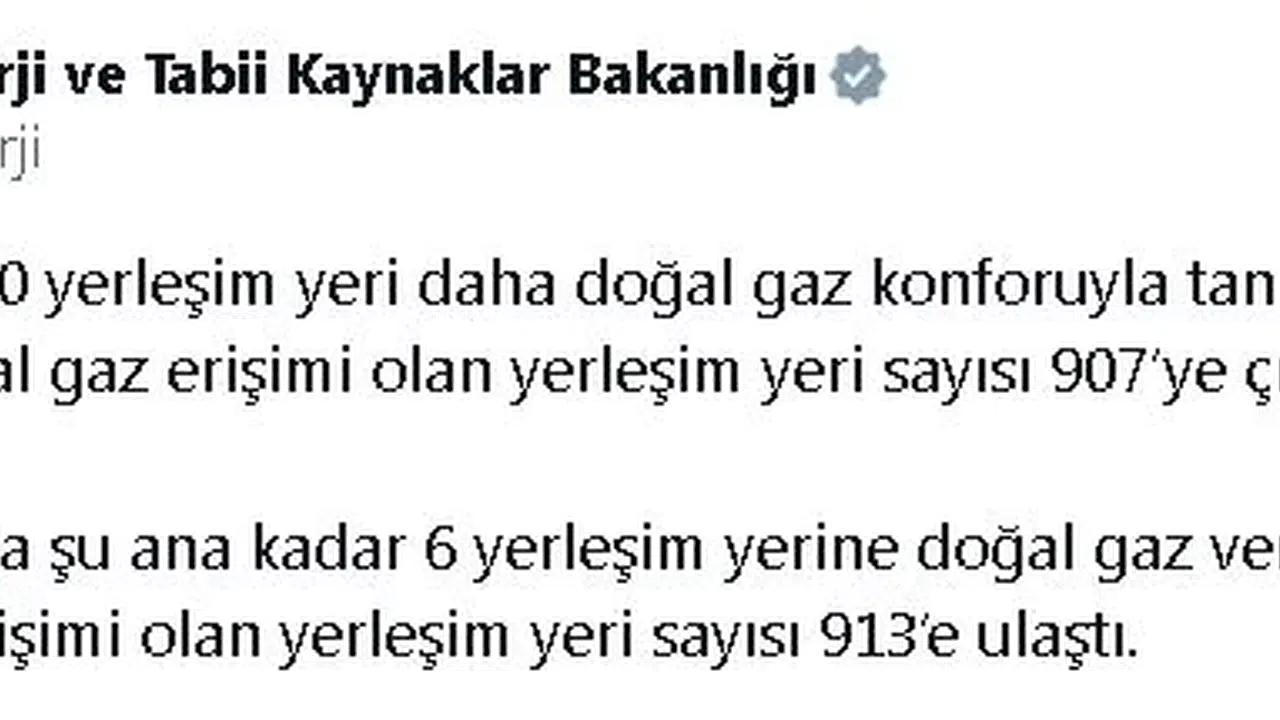 Bakanlıktan yapılan açıklamaya göre; 2024 yılında 60 yerleşim yerine daha doğal gaz iletildi. Yıl sonu itibarıyla doğal gaz bağlantısı sağlanan yerleşim yeri sayısı 907'ye çıktı. 2025 yılında da şu ana kadar 6 yerleşim yerine doğal gaz verildi. Böylece doğal gaza erişimi olan yerleşim yeri sayısı, 913'e ulaştı. 2025 yılı sonuna kadar toplam 96, 2026 yılında da 44 yerleşim yerine daha doğal gaz ulaştırılması hedefleniyor. Böylece 2026 sonu itibarıyla 1053 yerleşim yerinde doğal gaz kullanılacak.