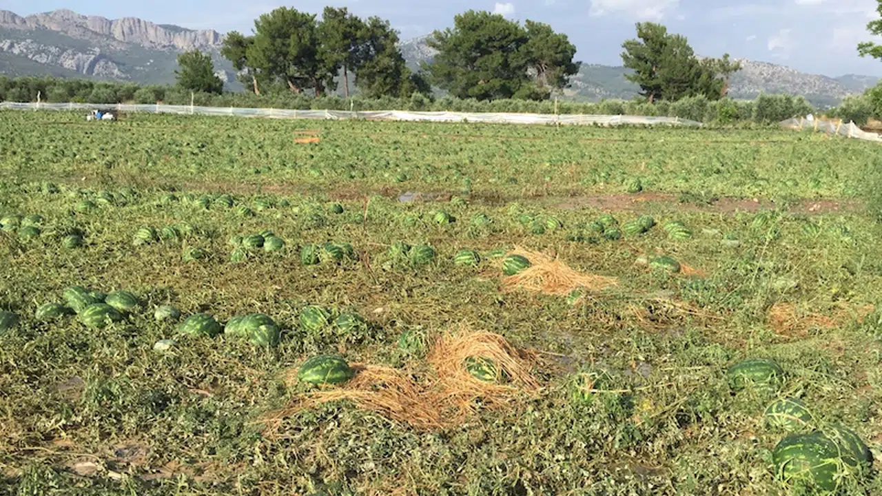 Serik ilçesi Alacami, Kuşlar ve Yeşilyurt mahallelerinde dün saat 15.00 sıralarında aniden dolu yağışı başladı. Dolu nedeniyle açık alanda karpuz, patlıcan, biber, kabak ve kereviz ekili yaklaşık 1500 dekar alanın yanı sıra zeytin bahçelerinde hasar oluştu. İlçe Orman ve Tarım Müdürlüğü ekipleri bölgede ön hasar tespit çalışmaları başlatırken, Kaymakam Cemal Şahin de Tarım ve Orman İlçe Müdürü Mustafa Çömezoğlu ile incelemelerde bulundu. Kaymakam Şahin doludan zarar gören çiftçilere geçmiş olsun dileklerini iletti. (DHA)