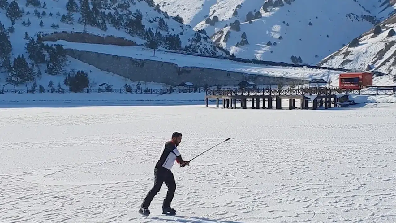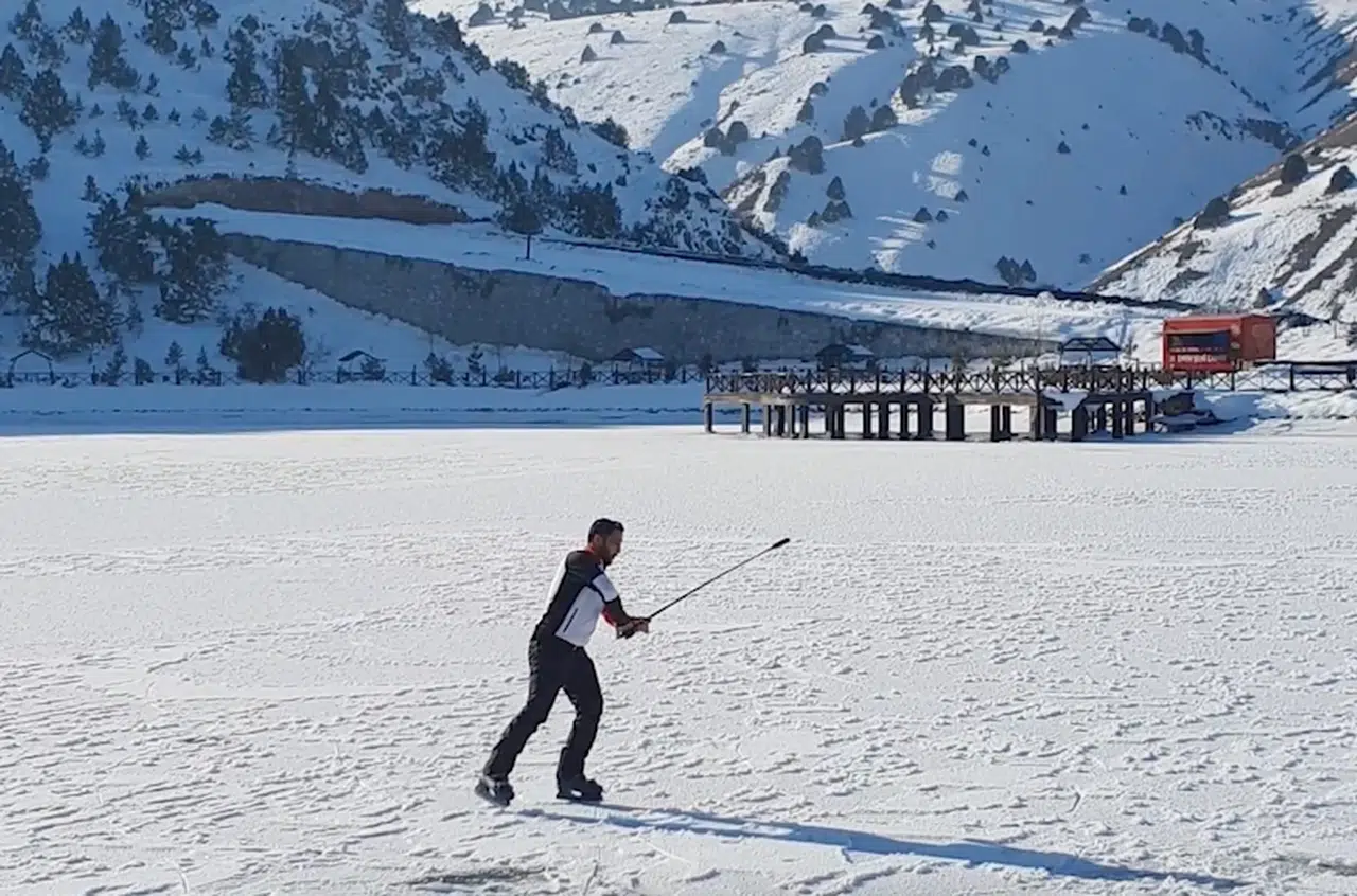 Muzaffer KOŞAN/ERZİNCAN, (DHA)- HAVA sıcaklığının yüksek kesimlerde sıfırın altında 25 dereceye kadar düştüğü Erzincan'da, Ergan Dağı Kış Sporları ve Doğa Turizm Merkezi'ndeki 1700 rakımlı Ardıçlı Gölü'nün yüzeyi buz tuttu. Adrenalin tutkunlarına ev sahipliği yapan, 20-25 santim buz tabakasıyla kaplanan gölde kayak antrenörü Canser Atila, buz pateni yaptı.