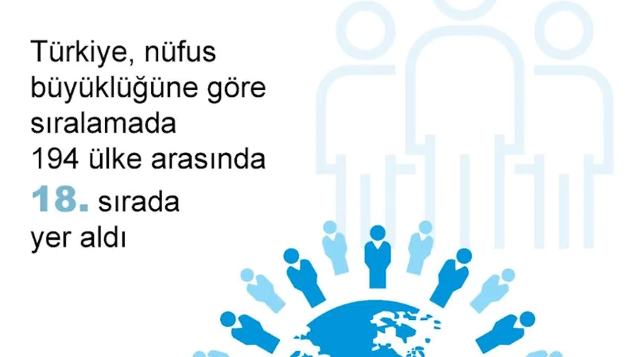 Caner ÜNVER/ANKARA, (DHA)- TÜRKİYE İstatistik Kurumu (TÜİK), Türkiye'nin 85 milyon 372 bin 377 nüfusu ile nüfus büyüklüğüne göre 194 ülke arasında 18'inci sırada yer alırken; dünya toplam nüfusunun yüzde 1,1'ini oluşturduğunu açıkladı.