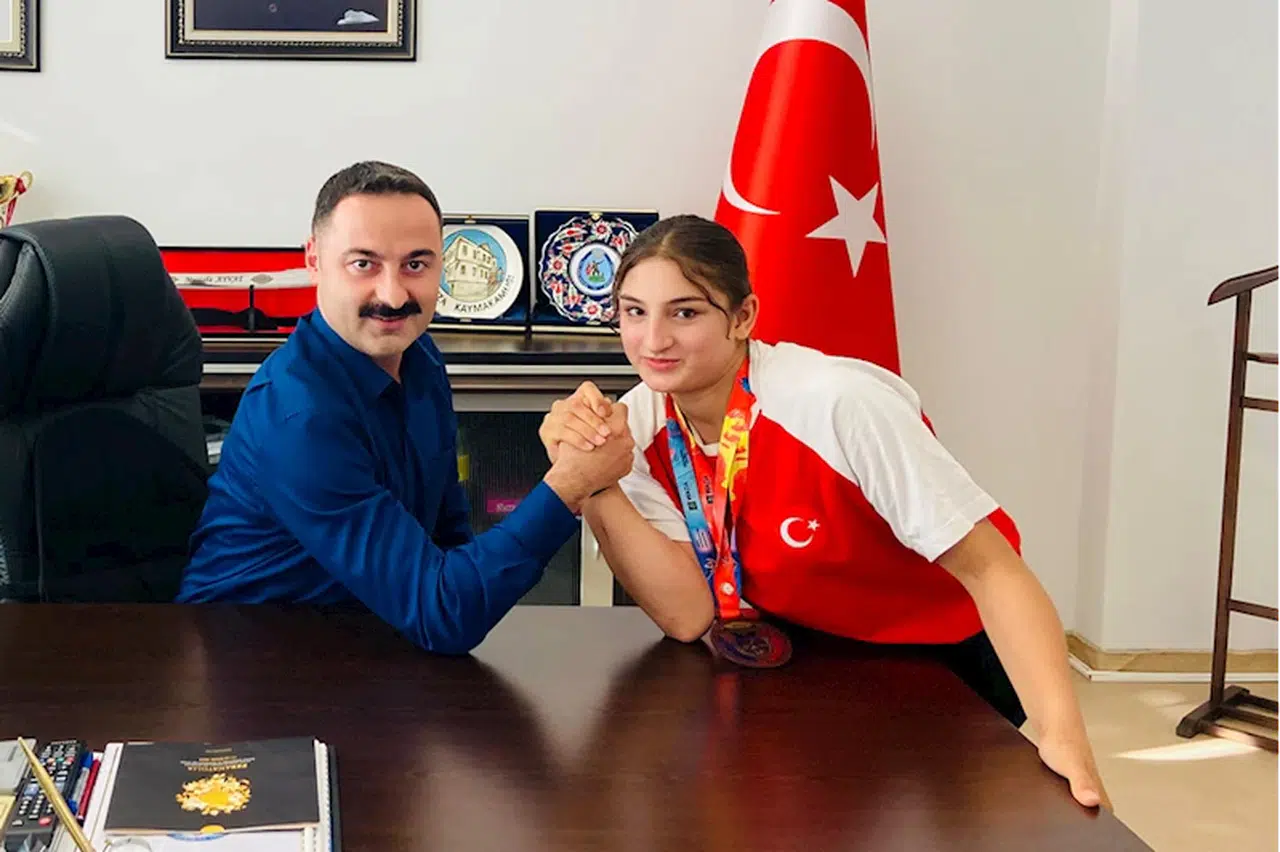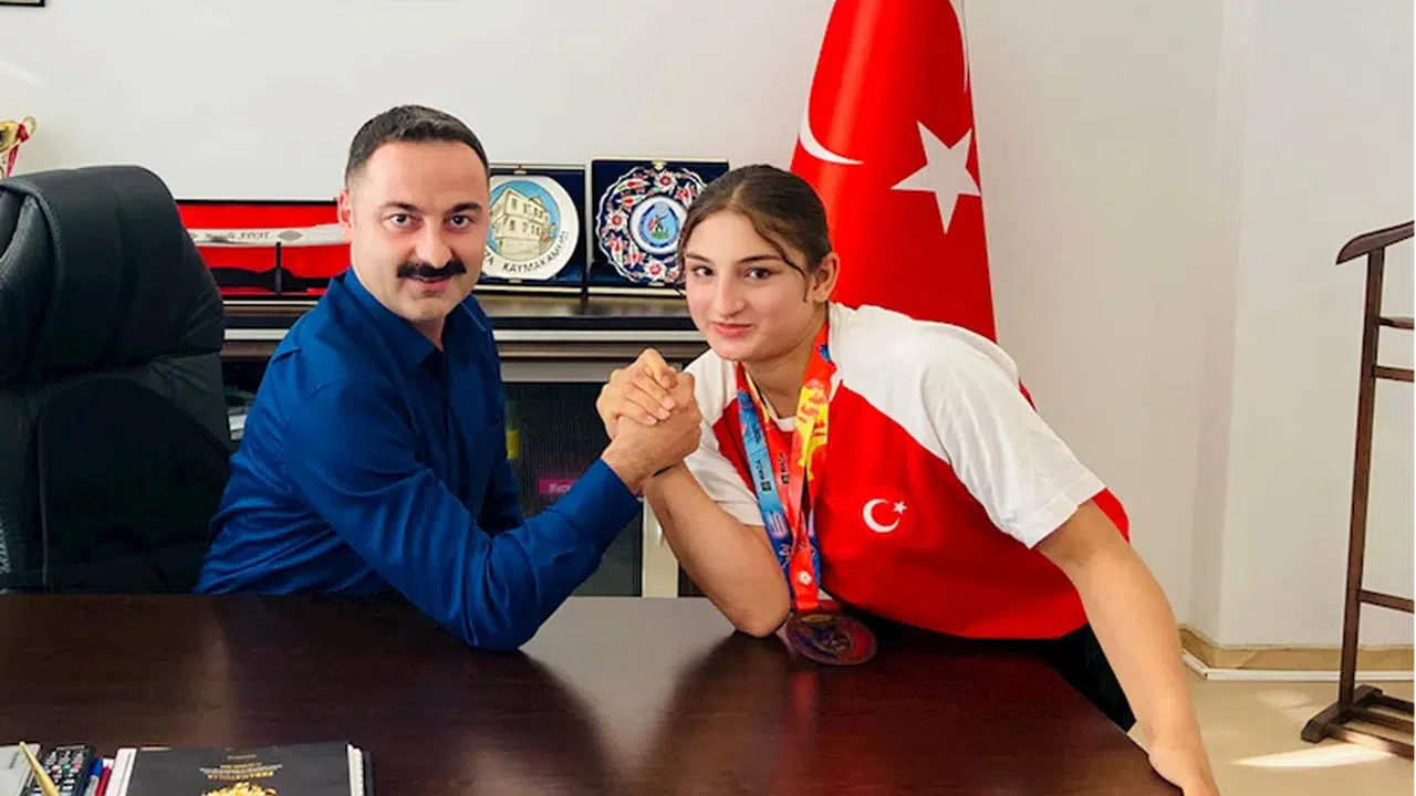 SAMSUN (AA) - Moldova'da düzenlenen Dünya Şampiyonası'nda 55 kiloda sağ kolda dünya şampiyonu, sol kolda dünya üçüncüsü olan 14 yaşındaki Şaziye Demir Havza Kaymakamı Mustafa Ayvat'ı ziyaret etti.