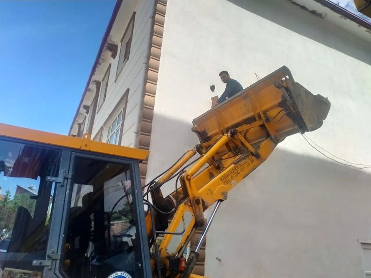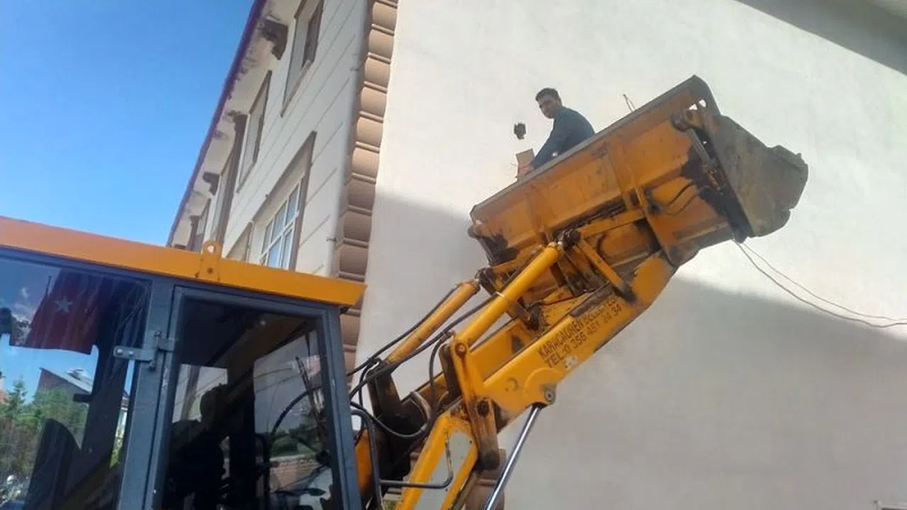 Belediyenin gönderdiği kepçenin yardımı ile çatıya kadar ulaşan bir kişi yavruları yuvaya yerleştirdi.