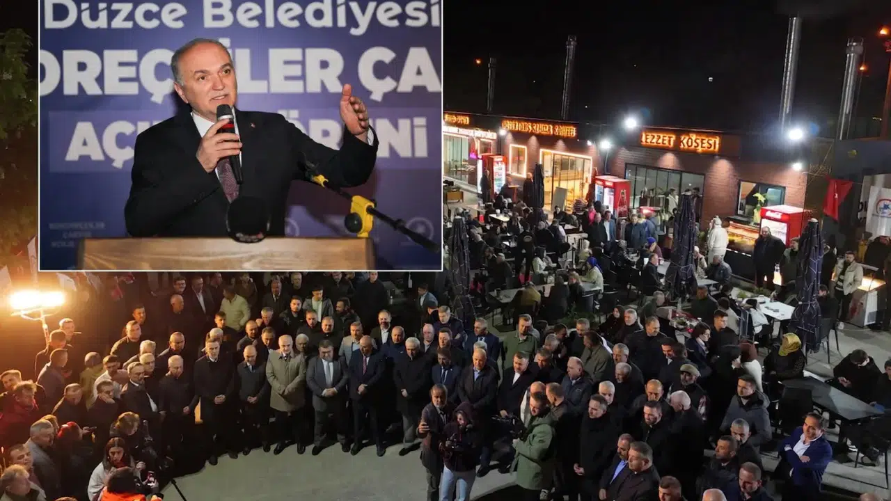 Törende konuşan Belediye Başkanı Dr. Faruk Özlü, kokoreççilerin daha önce Asar Deresi kenarında, fiziki koşulları yetersiz bir alanda hizmet verdiğini hatırlatarak, “Orası derme-çatma bir yerdi. Hijyen sorunları vardı, tuvalet ihtiyacı dahi tam anlamıyla karşılanamıyordu. Burayı taşımamız gerekiyordu. Burası gerçekten Düzce’nin merkezine makul mesafede olan bir yer. Belki de ilk defa bir gece açılışı yapıyoruz. Çünkü burası Kokoreççiler Çarşısı. Ben bu vesile ile bazı arkadaşlara teşekkür etmek istiyorum. Sayın Mehmet Habiboğlu’nun ve Nurhan Kartal’ın. Milli Emlak’ın yerinde bu tesisleri inşa ettik. Bu binaların yapımına katkı sağlayan arkadaşlarımıza teşekkür ediyorum. Düzce’mize hayırlı uğurlu olmasını diliyorum” dedi.