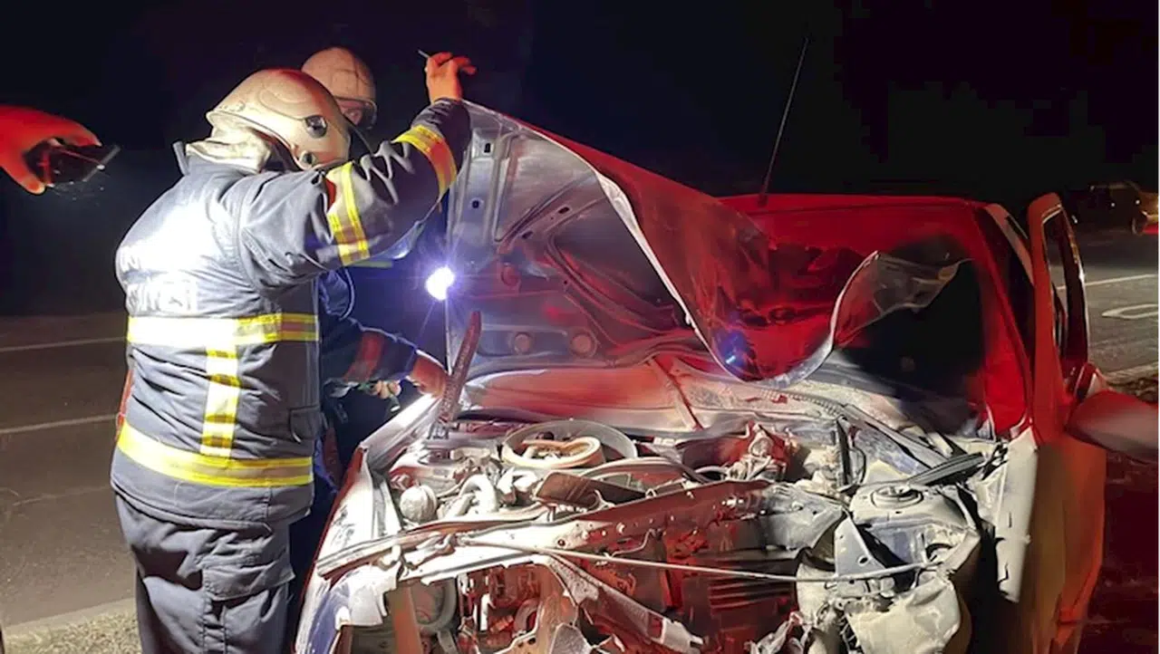 Refüjdeki aydınlatma direğine çarparak durabilen otomobilin ön tarafı alev aldı.