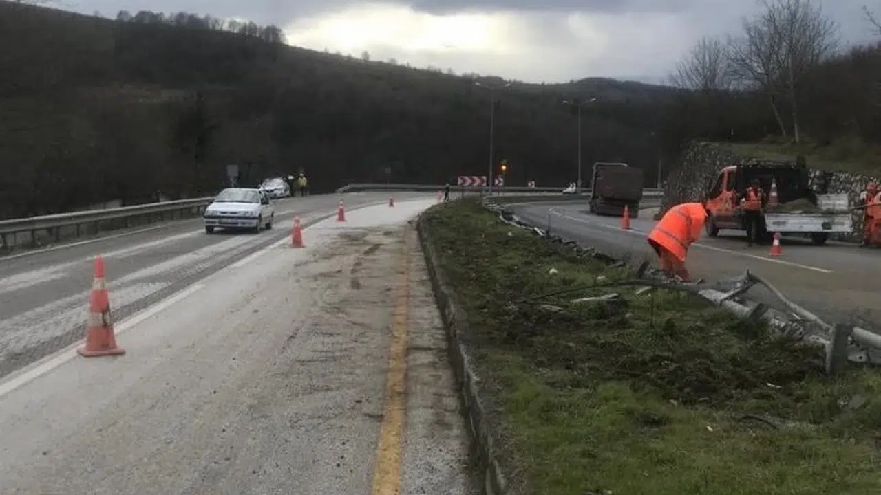 Düzce-Akçakoca bağlantı yolu Kabalak Mevkii'nde seyir halinde olan 54 AK 950 plakalı tırın lastiğinin patlaması sonucunda sürücüsü direksiyon hakimiyetini kaybetti.