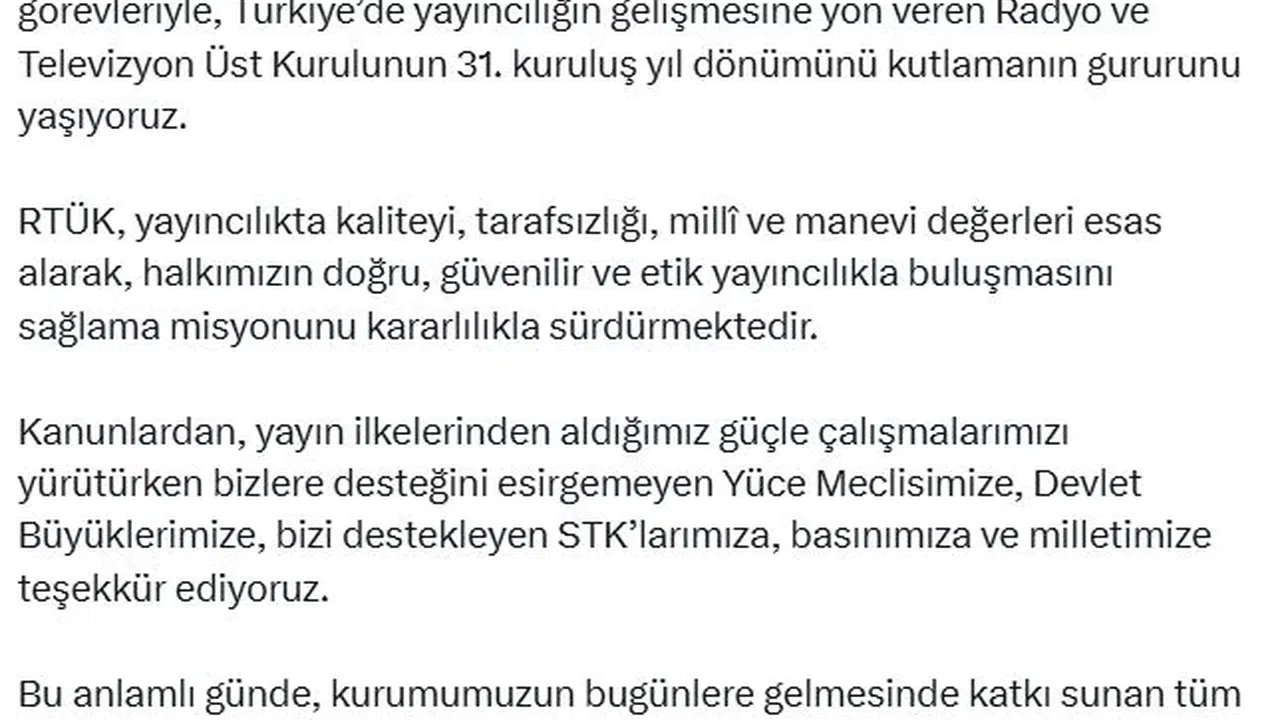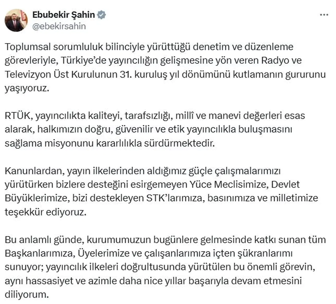 ANKARA, (DHA)- RADYO ve Televizyon Üst Kurulu (RTÜK) Başkanı Ebubekir Şahin, RTÜK’ün kuruluşunun 31’inci yıl dönümü dolayısıyla sosyal medya hesabından paylaşımda bulundu.