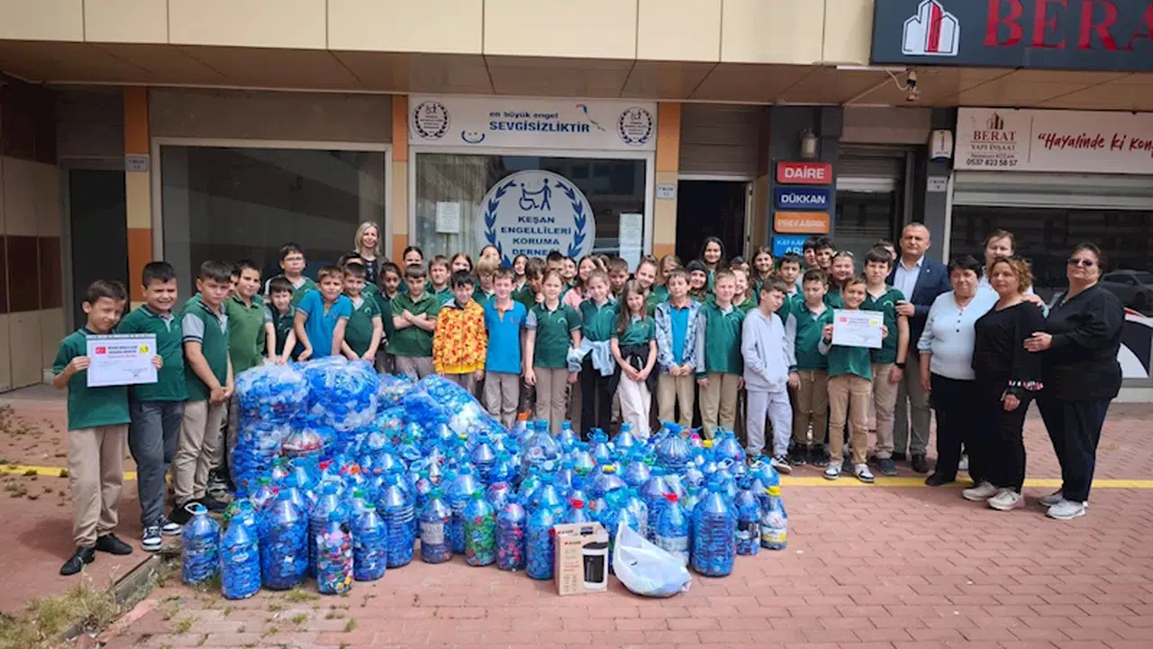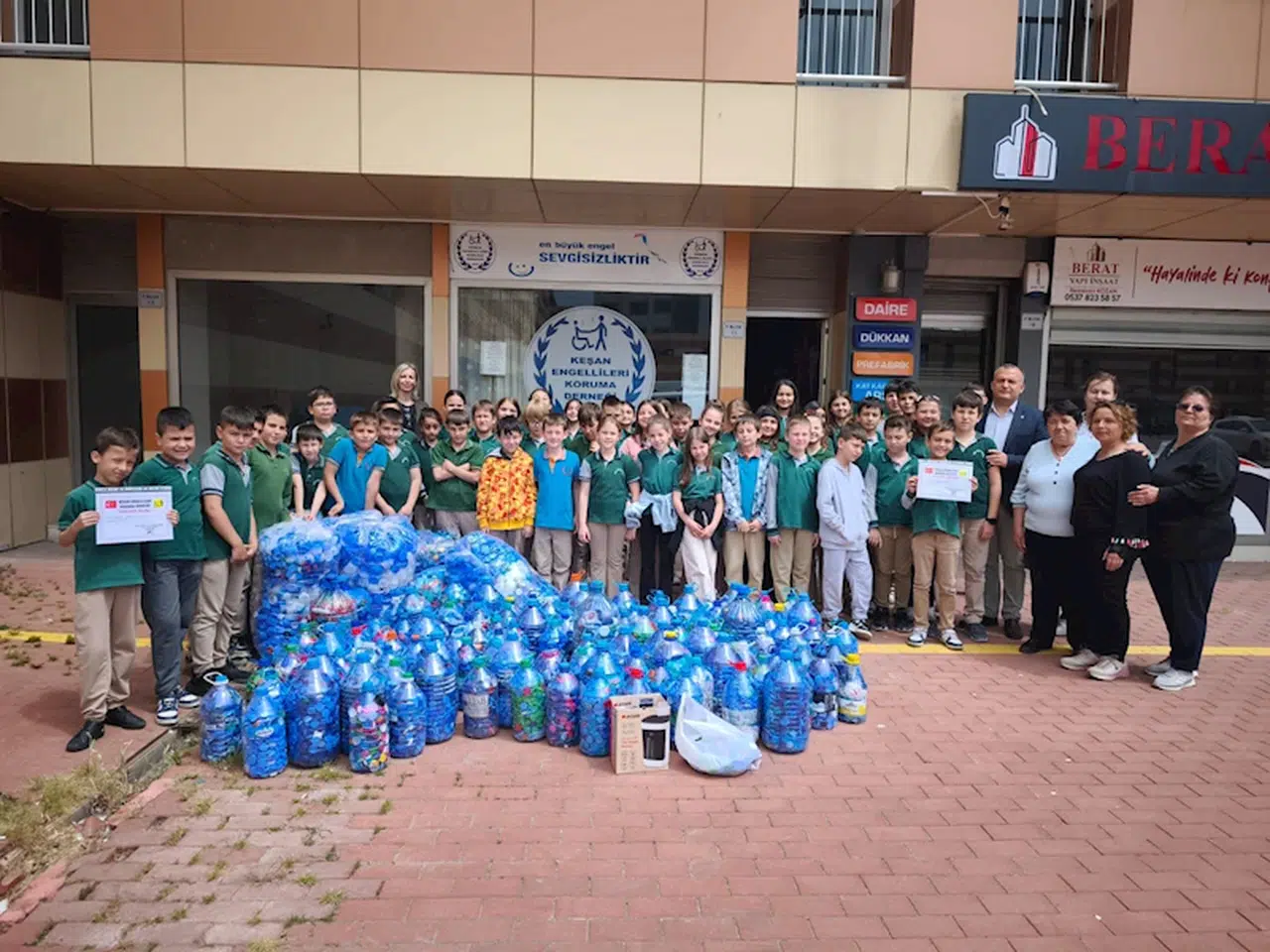 Ünsal YÜCEL/ EDİRNE,(DHA)-EDİRNE’nin Keşan ilçesinde Raşit Efendi İlkokulu öğrencileri ‘Sıfır atık projesi’ kapsamında topladıkları yaklaşık 10 bin mavi kapağı 10-16 Mayıs Engelliler Haftası etkinlikleri kapsamında Keşan Engellileri Koruma Derneği’ne teslim etti.