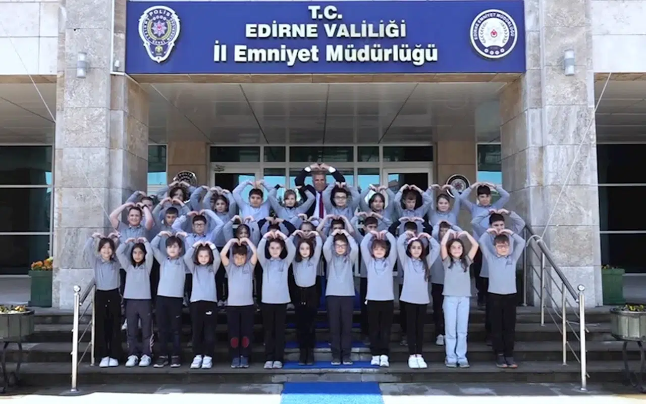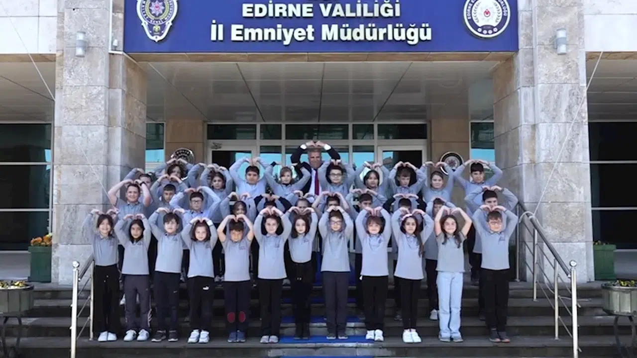 Edirne İl Emniyet Müdürlüğü’nü ziyaret eden 75’inci Yıl İlkokulu öğrencileri, İl Emniyet Müdürü Onur Karaburun ile görüşerek, polislerin haftasını kutladı. İl Emniyet Müdürlüğü hizmet binası önünde çekilen video klipte Türk polisine olan sevgisini ifade eden öğrenciler, polisin huzur ve güveninin teminatı olduğunu söyledi. Polisin, vatandaşların emniyeti için gece gündüz demeden görev yaptığı anlatılan video klip, öğrencilerin elleriyle kalp simgesi yapmasıyla son buldu. İl Emniyet Müdürlüğü’nün sosyal medya hesaplarında paylaşılan video, çok sayıda izlenme ve beğeni aldı. (DHA)