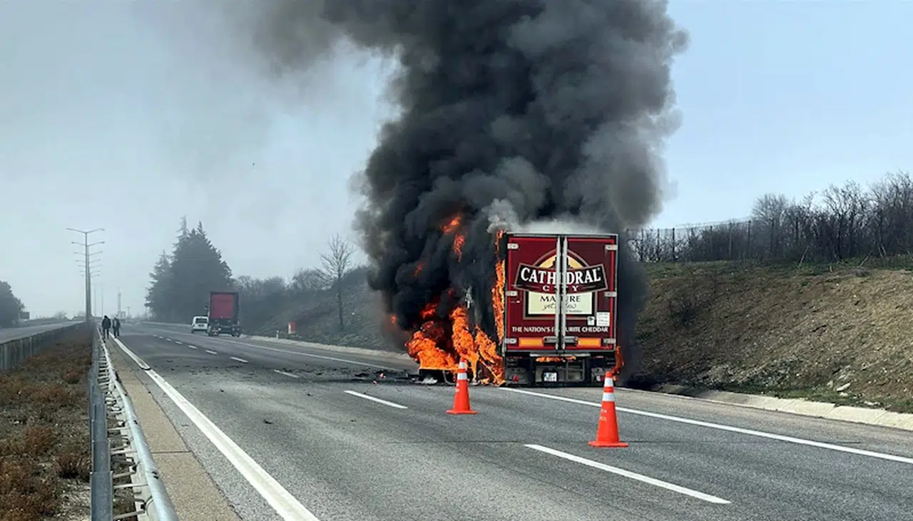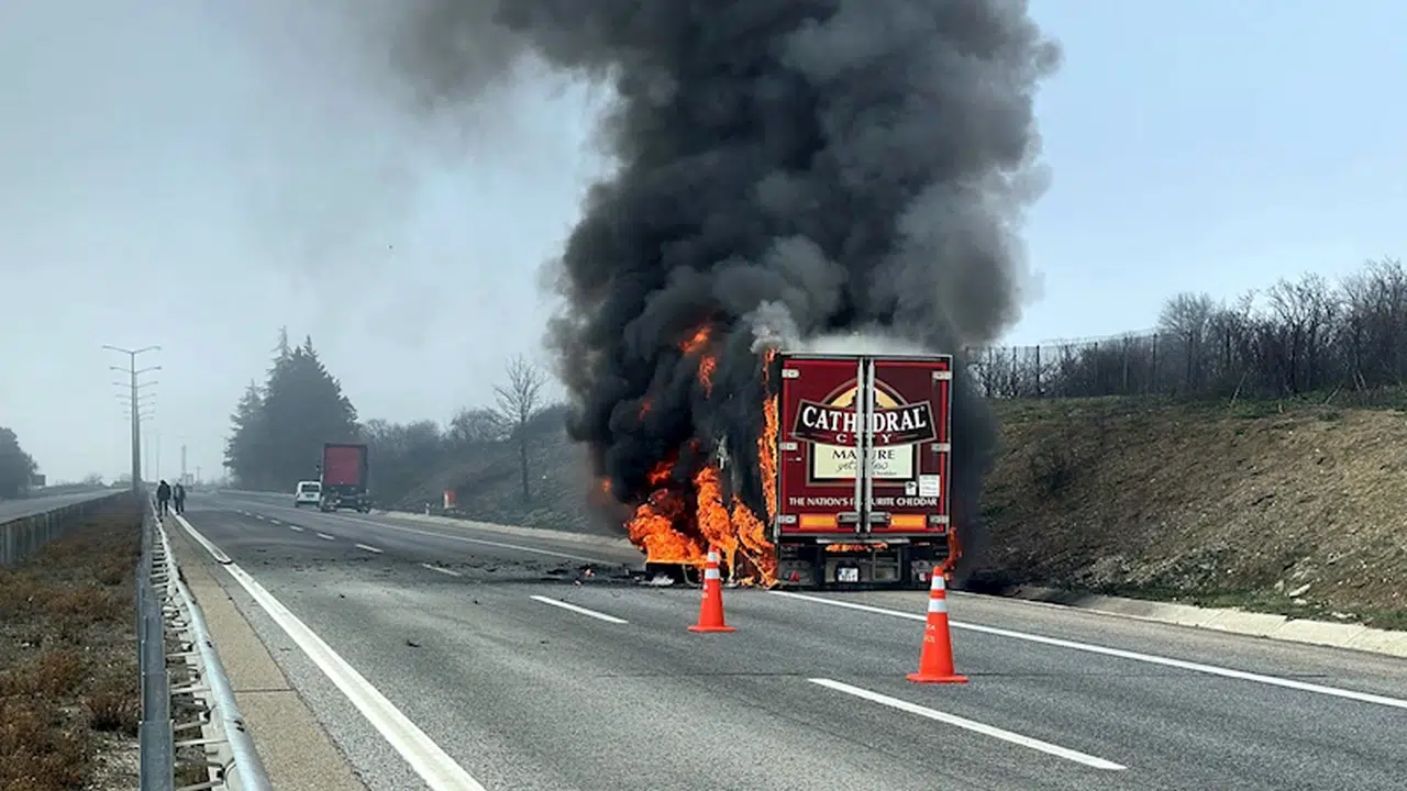 Edirne-Kapıkule kara yolunda, Kapıkule istikametine giden Archıl Gobadze'nin kullandığı UF 001 IT plakalı limonata yüklü TIR'ın dorsesinde alevler yükseldi. Alevleri gören sürücü, çekiciyi dorseden ayırıp uzaklaştırdı. Dorse alev alev yanarken, ihbarla bölgeye polis, sağlık ve itfaiye ekipleri sevk edildi. Kapıkule Sınır Kapısı'na giden yol trafiğe kapatıldı, itfaiye ekipleri alevlere müdahale etti. İtfaiyenin müdahalesiyle alevler söndürülürken, dorse kullanılamaz hale geldi. Kapanan yol açılırken, yangının çıkış nedeni araştırılıyor. (DHA)
