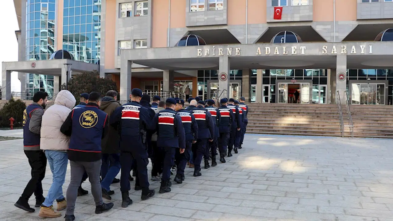 Jandarma'daki işlemlerinin ardından Edirne Adliyesi'ne sevk edilen şüphelilerin, sorgusu sürüyor. (DHA)