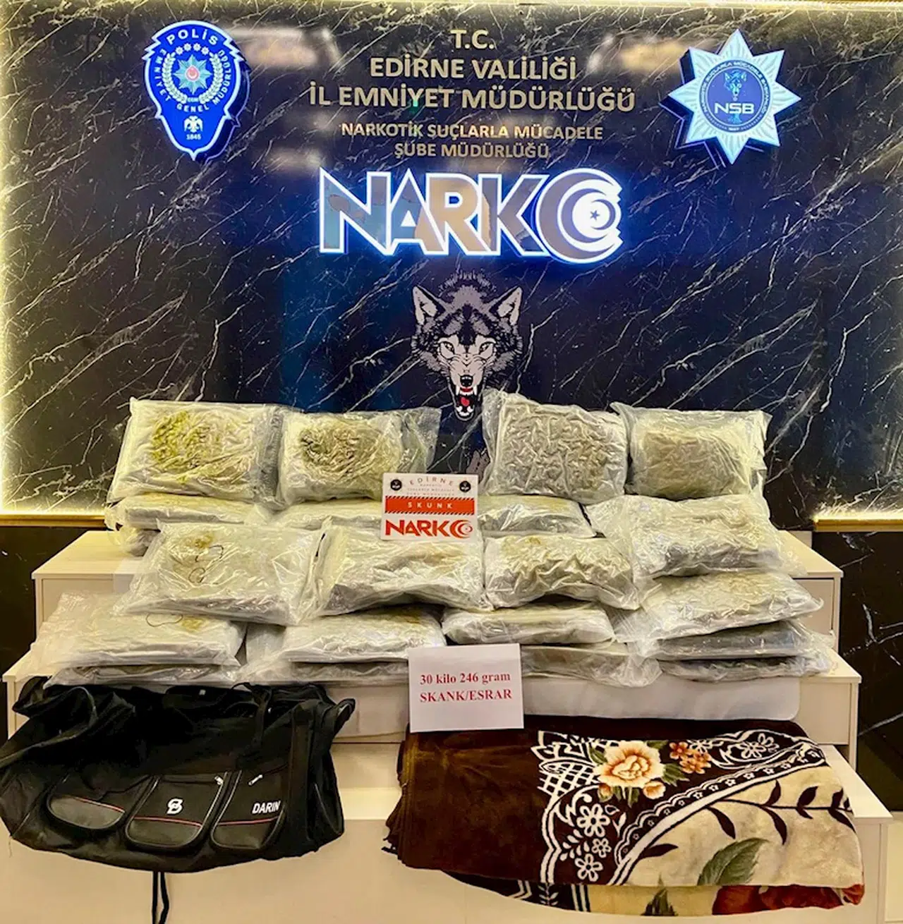 İl Emniyet Müdürlüğü Narkotik Suçlarla Mücadele Şube Müdürlüğü ekipleri, Kapıkule Sınır Kapısı’ndan yurda girecek bir TIR’da uyuşturucu madde bulunduğu bilgisini aldı. V.U.’nun kullandığı TIR’da, yurda giriş yaptıktan sonra durdurularak yapılan aramada 30 kilo 246 gram skunk ele geçirildi.