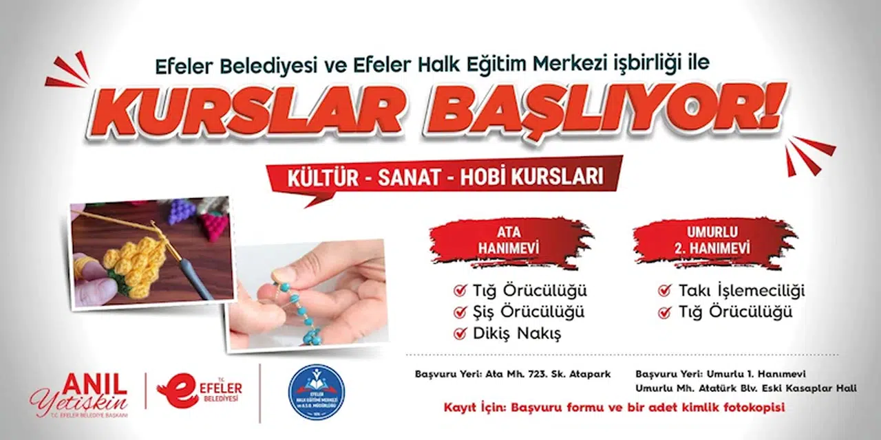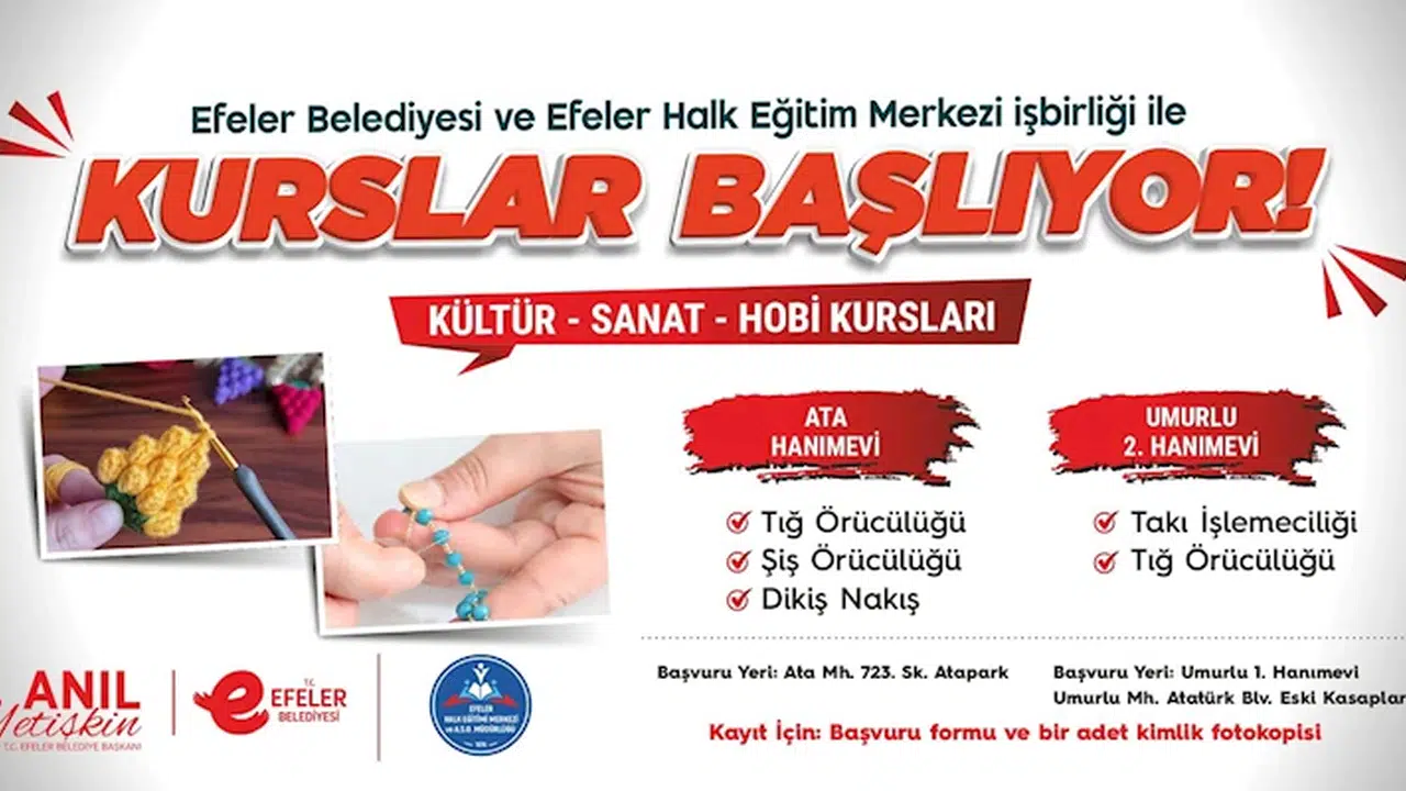 AYDIN, (DHA)-AYDIN'ın Efeler ilçesi Belediyesi, Efeler Halk Eğitim Merkezi iş birliğiyle kültür, sanat ve hobi kursları düzlenlendi. Kurslara başvurular kimlik kartı fotokopisi ile yapılabildiği bildirildi. Efeler Belediye Başkanı Anıl Yetişkin, kurslarla kadınların hem bireysel gelişimlerini hem de toplumsal katılımlarını artırmayı amaçladıklarını söyledi.