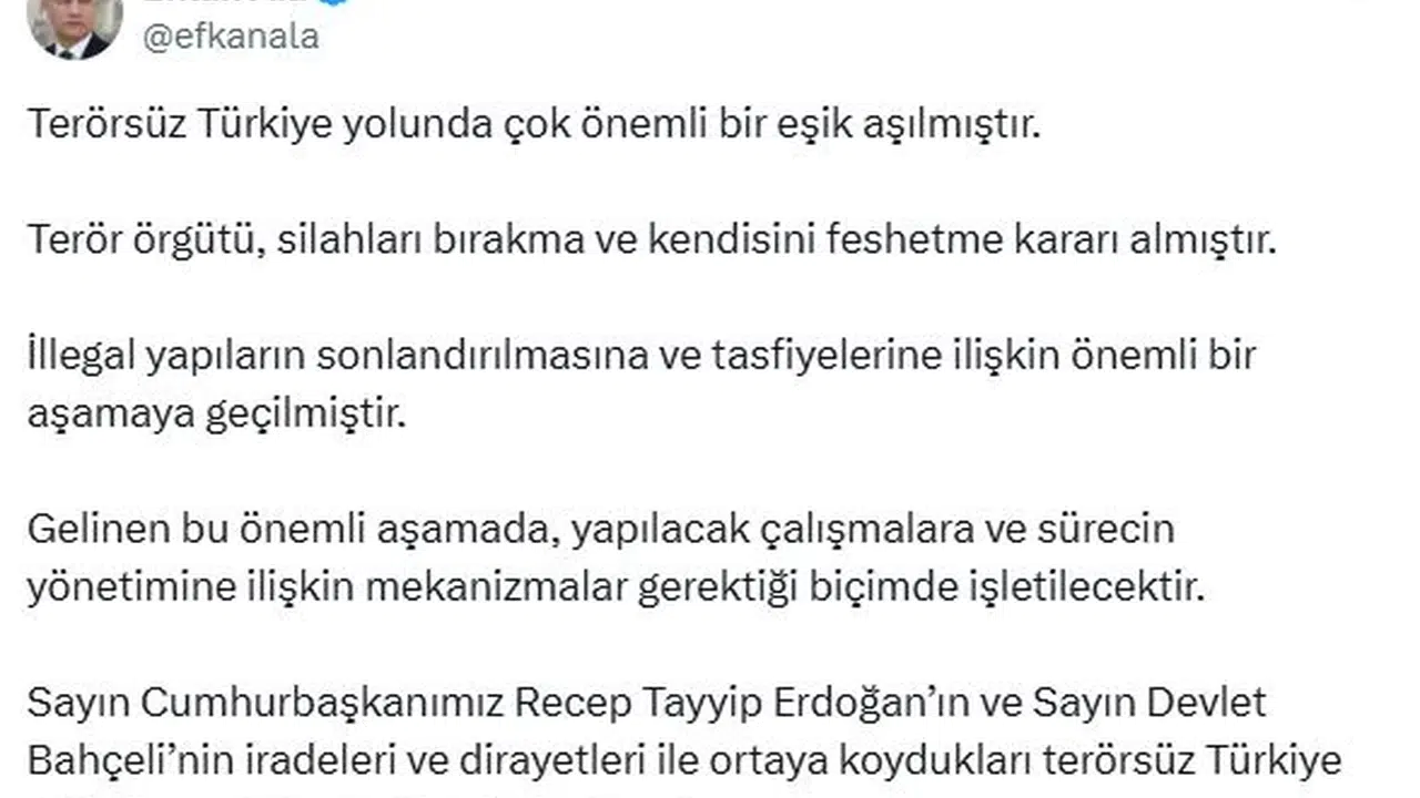 AK Parti Genel Başkan Vekili ve Bursa Milletvekili Efkan Ala, terör örgütü PKK'nın silah bırakma ve fesih kararı ile ilgili sosyal medya hesabından açıklama yaptı. Ala, "Terörsüz Türkiye yolunda çok önemli bir eşik aşılmıştır. Terör örgütü, silahları bırakma ve kendisini feshetme kararı almıştır. İllegal yapıların sonlandırılmasına ve tasfiyelerine ilişkin önemli bir aşamaya geçilmiştir. Gelinen bu önemli aşamada, yapılacak çalışmalara ve sürecin yönetimine ilişkin mekanizmalar gerektiği biçimde işletilecektir. Sayın Cumhurbaşkanımız Recep Tayyip Erdoğan’ın ve Sayın Devlet Bahçeli’nin iradeleri ve dirayetleri ile ortaya koydukları 'Terörsüz Türkiye' hedefine doğru kararlılıkla ilerliyoruz" ifadelerini kullandı. (DHA)