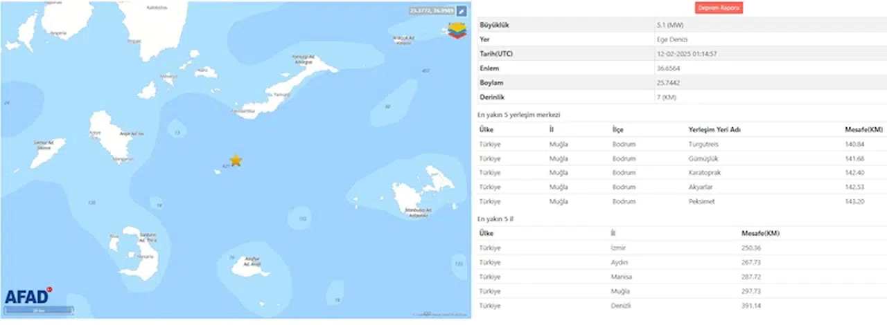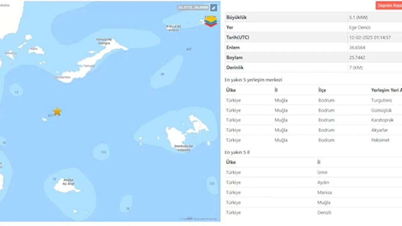 Afet ve Acil Durum Yönetimi Başkanlığı'ndan (AFAD) alınan bilgiye göre, saat Ege Denizi'nde 04.14'de 5.1 büyüklüğünde bir deprem daha meydana geldi. Richter ölçeğine göre yerin 7 kilometre altında kaydedilen sarsıntı, Muğla'nın Bodrum ilçesine 140.84 kilometre, İzmir'e ise 250.36 kilometre uzaklıkta meydana geldi. Depremin ayrıca Aydın, Manisa, Balıkesir ve Çanakkale illerinde de hissedildiği bildirildi. (DHA)
