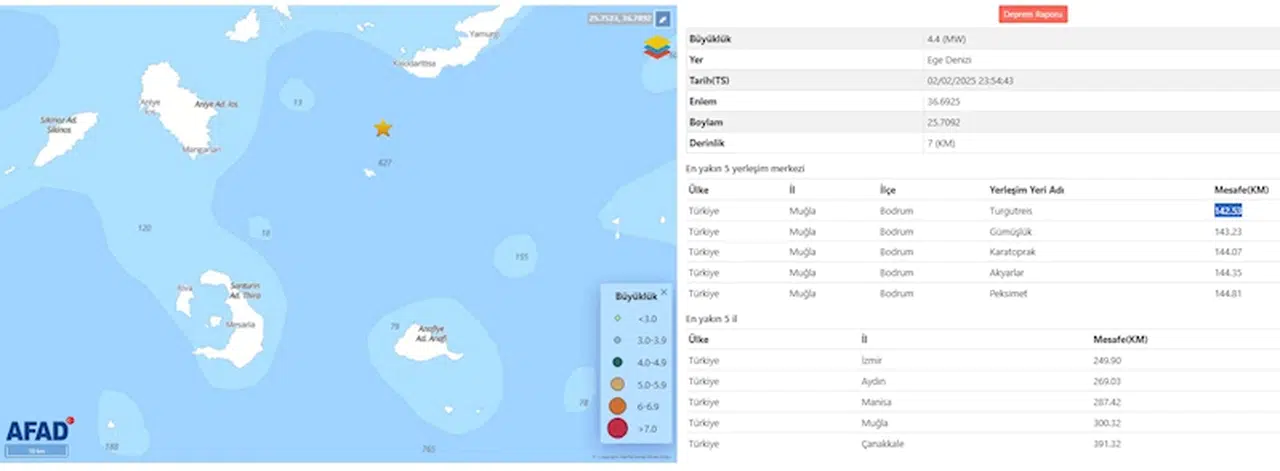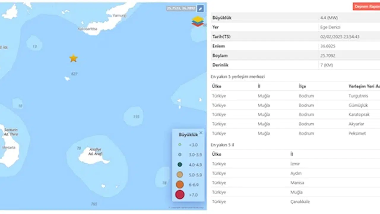 Afet ve Acil Durum Yönetimi Başkanlığı (AFAD) verilerine göre, saat 02.54’te merkez üssü Ege Denizi'nin Aniye ile Santorini Adası açıkları olan 4.4 büyüklüğünde deprem meydana geldi. Zeminden 7 kilometre derinlikte kaydedilen depremin, Türkiye sınırlarına en yakın kara parçası olan Muğla'nın Bodrum ilçesine, 142.53 kilometre uzaklıkta olduğu belirlendi. Depremde Ege bölgesinde herhangi bir olumsuzluk yaşanmadığı belirtildi. (DHA)
