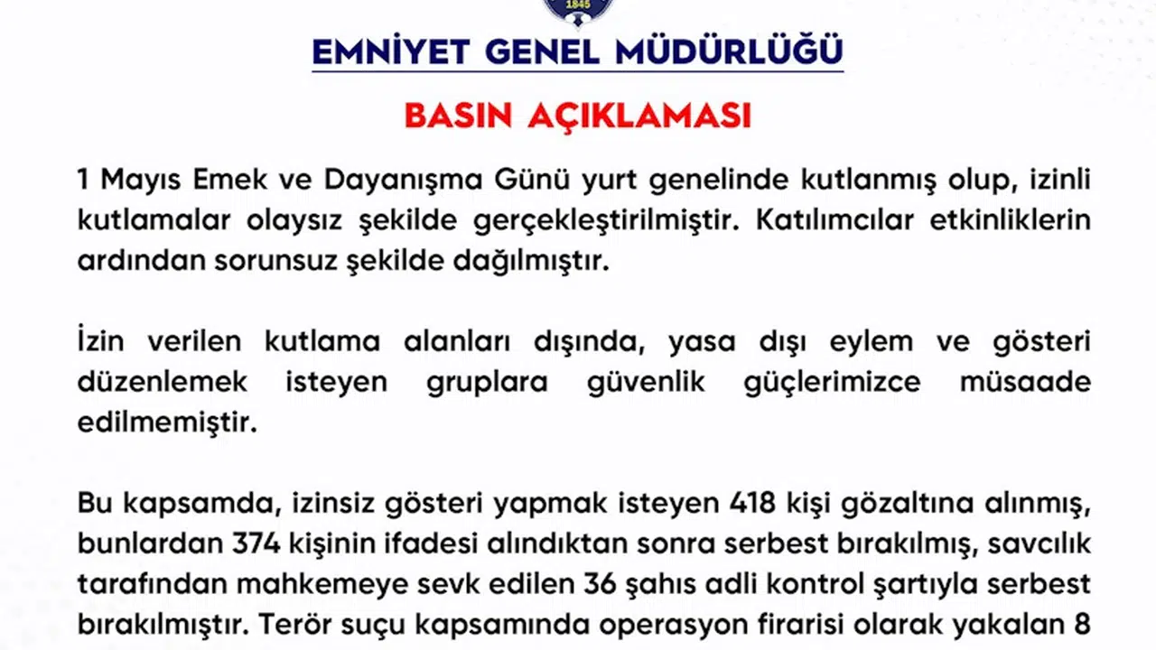 Emniyet Genel Müdürlüğü sosyal medya hesabından yapılan paylaşımda, “1 Mayıs Emek ve Dayanışma Günü yurt genelinde kutlanmış olup, izinli kutlamalar olaysız şekilde gerçekleştirilmiştir. Katılımcılar etkinliklerin ardından sorunsuz şekilde dağılmıştır. İzin verilen kutlama alanları dışında, yasa dışı eylem ve gösteri düzenlemek isteyen gruplara güvenlik güçlerimizce müsaade edilmemiştir. Bu kapsamda, izinsiz gösteri yapmak isteyen 418 kişi gözaltına alınmış, bunlardan 374 kişinin ifadesi alındıktan sonra serbest bırakılmış, savcılık tarafından mahkemeye sevk edilen 36 şahıs adli kontrol şartıyla serbest bırakılmıştır. Terör suçu kapsamında operasyon firarisi olarak yakalan 8 şahıs hakkında adli işlemler devam etmektedir” ifadeleri kullanıldı. (DHA)