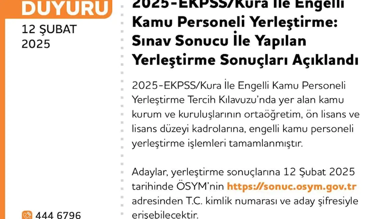 ÖSYM'den yapılan yazılı açıklamada, "2025-EKPSS/Kura İle Engelli Kamu Personeli Yerleştirme Tercih Kılavuzu'nda yer alan kamu kurum ve kuruluşlarının ortaöğretim, ön lisans ve lisans düzeyi kadrolarına, engelli kamu personeli yerleştirme işlemleri tamamlanmıştır. Adaylar, yerleştirme sonuçlarına 12 Şubat 2025 tarihinde saat 10.54'ten itibaren ÖSYM’nin https://sonuc.osym.gov.tr adresinden T.C. kimlik numarası ve aday şifresiyle erişebilecektir" denildi. (DHA)