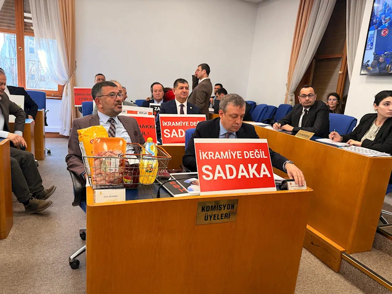 TBMM Plan ve Bütçe Komisyonu, AK Parti Samsun Milletvekili Mehmet Muş başkanlığında toplandı. Ramazan ve Kurban bayramlarında emeklilere verilen bayram ikramiyelerinin 4 bin lira olmasını da içeren 'Gençlik ve Spor Hizmetleri Kanunu ile Bazı Kanun ve Kanun Hükmünde Kararnamelerde Değişiklik Yapılmasına Dair Kanun Teklifi'nin görüşüldüğü komisyonda, CHP milletvekilleri kanun teklifinin öngördüğü zam miktarına tepki gösterdi. CHP'li vekiller, 'İkramiye değil sadaka', 'Emeklinin hakkı fitre değil', 'Zam 1000 TL, bozdur bozdur harca' yazılı dövizleri komisyona getirirken, CHP Malatya Milletvekili Veli Ağbaba da içerisinde gıda ürünleri bulunan alışveriş sepetiyle yer aldı. Ağbaba, "Bizi dinlemiyorsanız, Diyanet İşleri Başkanını dinleyin. Diyanet İşleri Başkanı, 'Emekliye fitre verin' diyor. Emekliyi getirdiğiniz durum bu. Sayın Başkan; muhtemelen babanız emekli, ona bir sorun, babanız vallahi size kızar. Demez mi; 'Mehmet Muş oğlum, bu parayı bana nasıl layık gördün.' Hüseyin Bey'in babası ile annesine de soralım, muhtemelen onlar da emekli. Kanun teklifi sahipleri pazara çıksa, vallahi teyzeler onları terlikle kovalar. Dolduruşa gelmiyorlar ama bir çıksınlar pazara teyzeler, amcalar ne yapıyor? Emekli gece yarısı pazardan, çöpten sebzeyi ve meyveyi alıyor" ifadelerini kullandı.