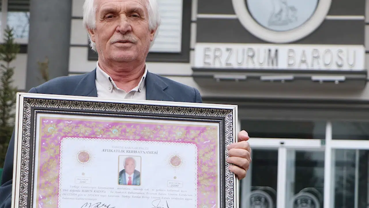 Turgay İPEK/ERZURUM, (DHA)- ERZURUM'da 30 yıl öğretmenlik yaptıktan sonra emekli olup girdiği üniversite sınavında çocukluk hayali Atatürk Üniversitesi Hukuk Fakültesi'ni kazanarak mezun olan evli, 4 çocuk ve 4 torun sahibi Harun Kazan (64), bir yıllık stajını da tamamlayıp ruhsatını alarak mesleğe ilk adımını attı.