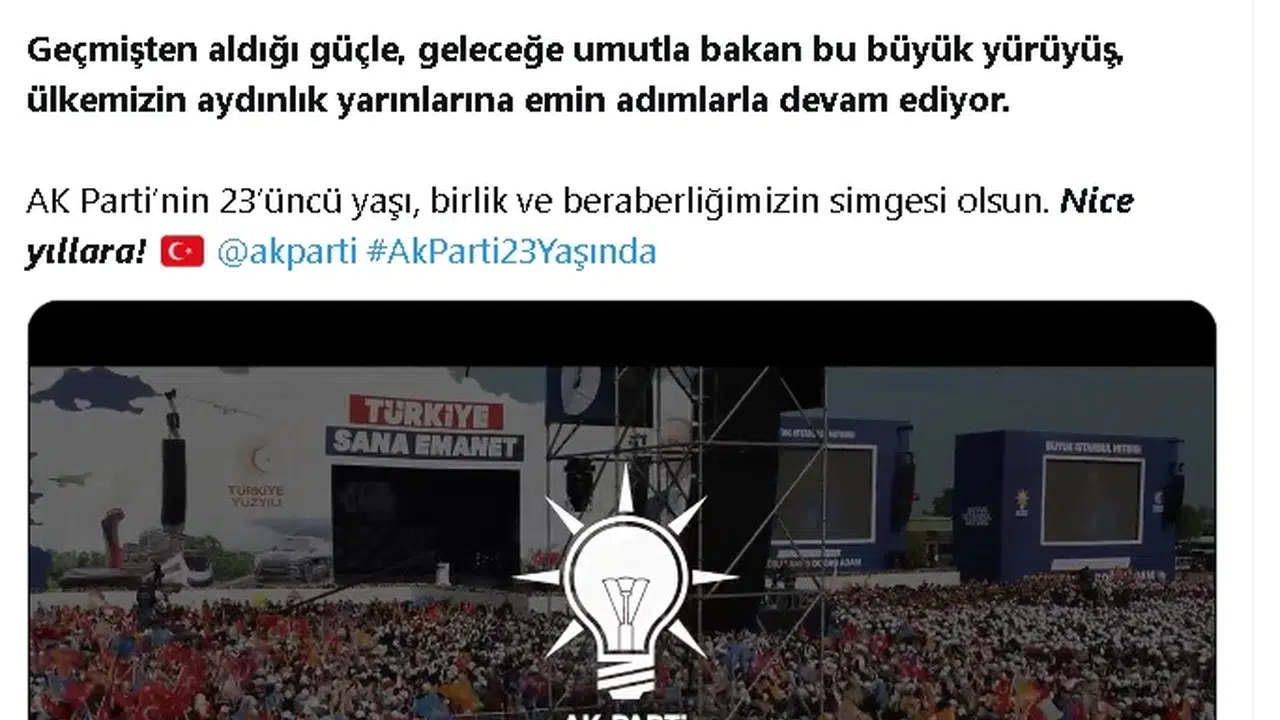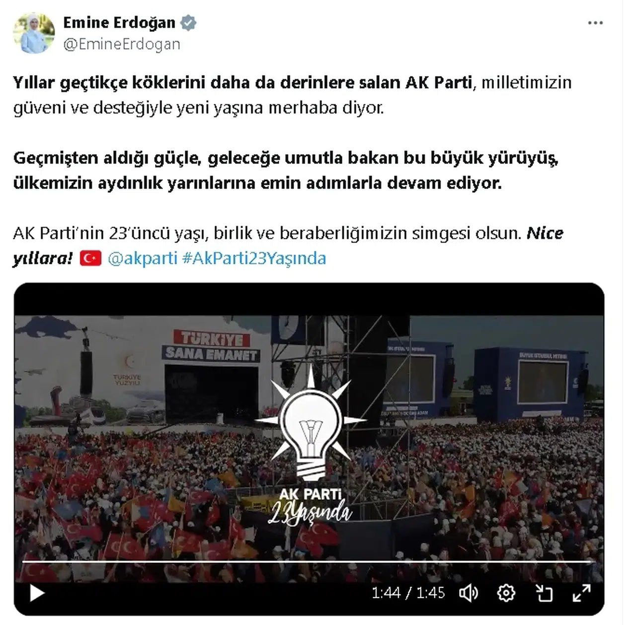 Cumhurbaşkanı Recep Tayyip Erdoğan'ın eşi Emine Erdoğan, sosyal medya hesabından yayımladığı mesajda, "Yıllar geçtikçe köklerini daha da derinlere salan AK Parti, milletimizin güveni ve desteğiyle yeni yaşına merhaba diyor. Geçmişten aldığı güçle, geleceğe umutla bakan bu büyük yürüyüş, ülkemizin aydınlık yarınlarına emin adımlarla devam ediyor. AK Parti'nin 23'üncü yaşı, birlik ve beraberliğimizin simgesi olsun. Nice yıllara" ifadelerini kullandı. (DHA)