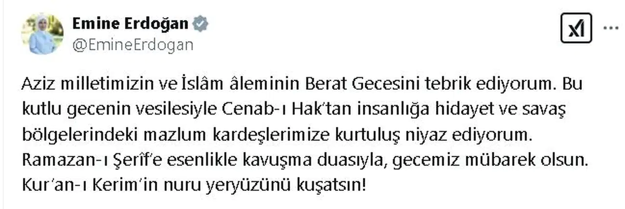 Emine Erdoğan, sosyal medya hesabından yaptığı paylaşımda, "Aziz milletimizin ve İslam aleminin Berat Gecesi'ni tebrik ediyorum. Bu kutlu gecenin vesilesiyle Cenab-ı Hak'tan insanlığa hidayet ve savaş bölgelerindeki mazlum kardeşlerimize kurtuluş niyaz ediyorum. Ramazan-ı Şerif'e esenlikle kavuşma duasıyla, gecemiz mübarek olsun. Kur'an-ı Kerim'in nuru yeryüzünü kuşatsın" dedi. (DHA)